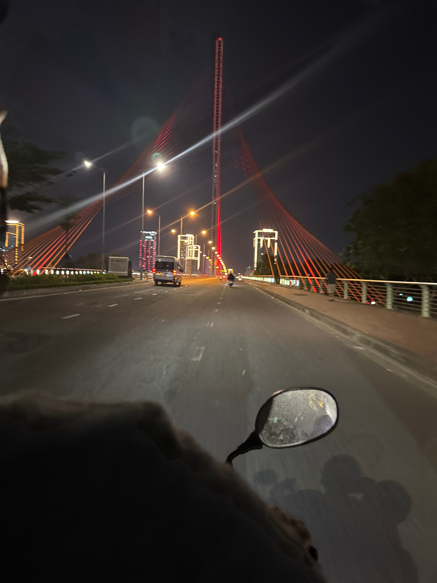 The image, oriented horizontally, presents a nighttime view from the perspective of someone riding a motorcycle or scooter across a prominent bridge in Đà Nẵng, Vietnam. In the foreground, the upper right portion shows part of a motorcycle's handlebar and a dirty rearview mirror, reflecting blurred lights. A partial view of the rider's arm or gloved hand is also visible on the right edge. The scene unfolds on a multi-lane road, likely a bridge, with clear white lane markings. Numerous streetlights illuminate the asphalt and cast a glow on a median strip, which features small trees or bushes. Several other vehicles, including cars and motorcycles, can be seen ahead, indicated by their taillights, suggesting traffic moving in the same direction. The most striking feature of the background is a large cable-stayed bridge, a signature structure of Đà Nẵng, such as the Tran Thi Ly Bridge. Its many cables are dramatically lit in red, fanning out from tall, brightly illuminated pylons. Additional lights outline the bridge's main deck and illuminate distant buildings, contributing to the vibrant urban nightscape. Bright light sources create visible lens flares in the dark sky. The time of day is clearly night, with no natural light present. The weather appears clear. The activity depicted is riding a motorcycle on a busy bridge at night. No discernible text is clearly visible on any signs or structures. | Open Wire