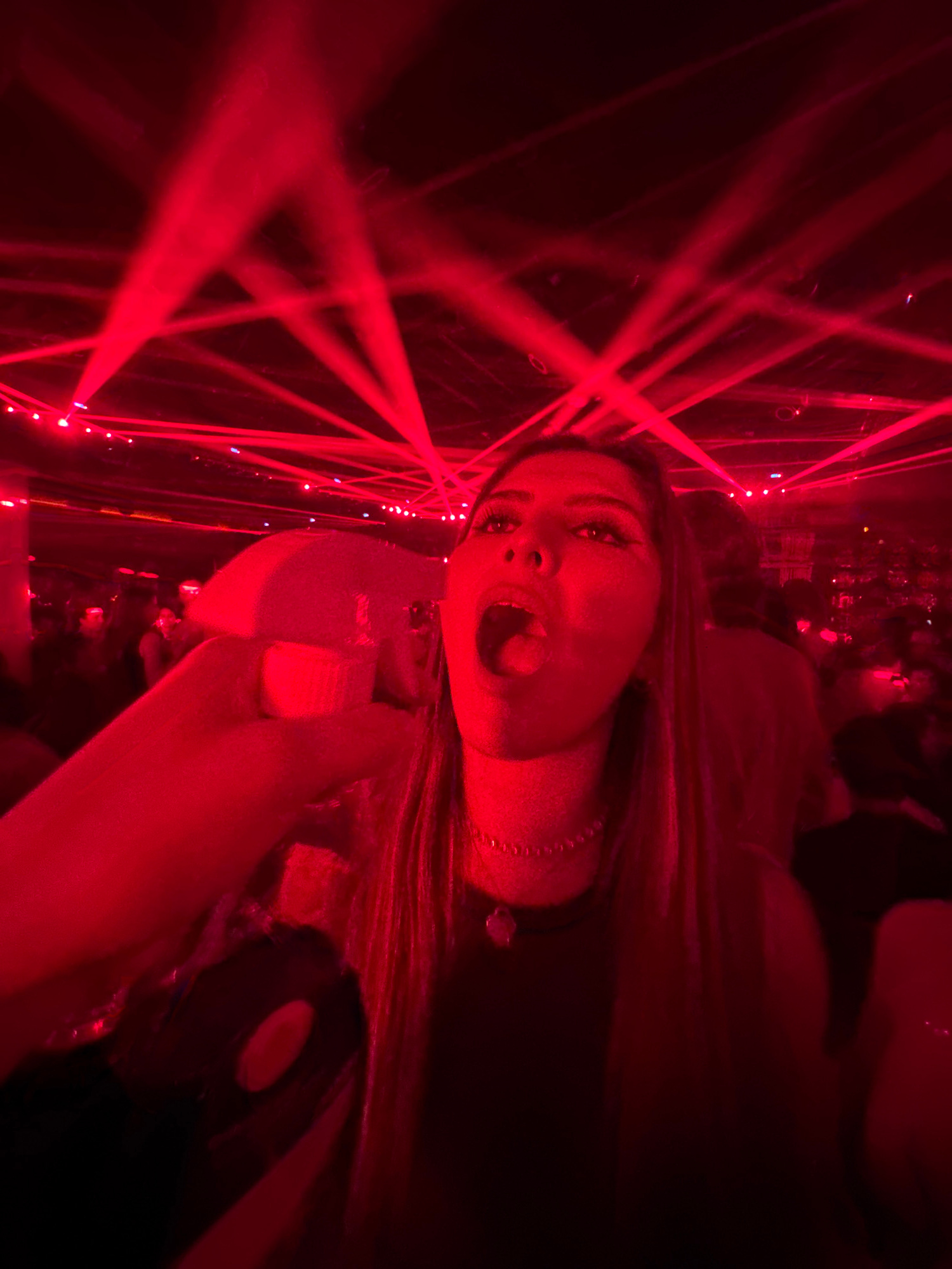 This media file captures a vibrant, high-energy scene featuring a woman in a dark, club-like environment, intensely illuminated by numerous red laser beams. The image is oriented with the woman's head…read more