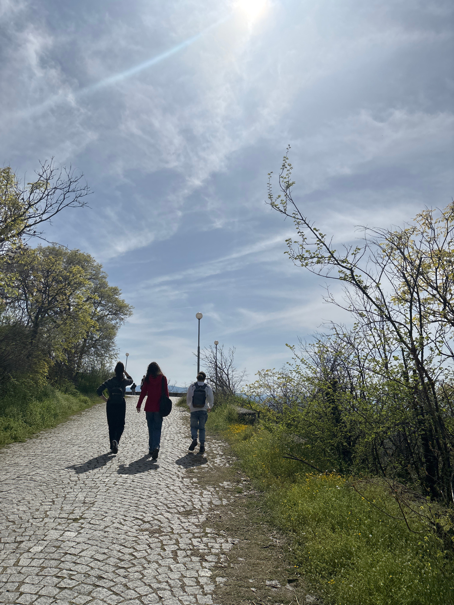 The image depicts an outdoor scene on a sunny day, likely in a park or scenic area of Plovdiv, Bulgaria. Three individuals are walking away from the camera along a wide path paved with grey cobbleston…read more