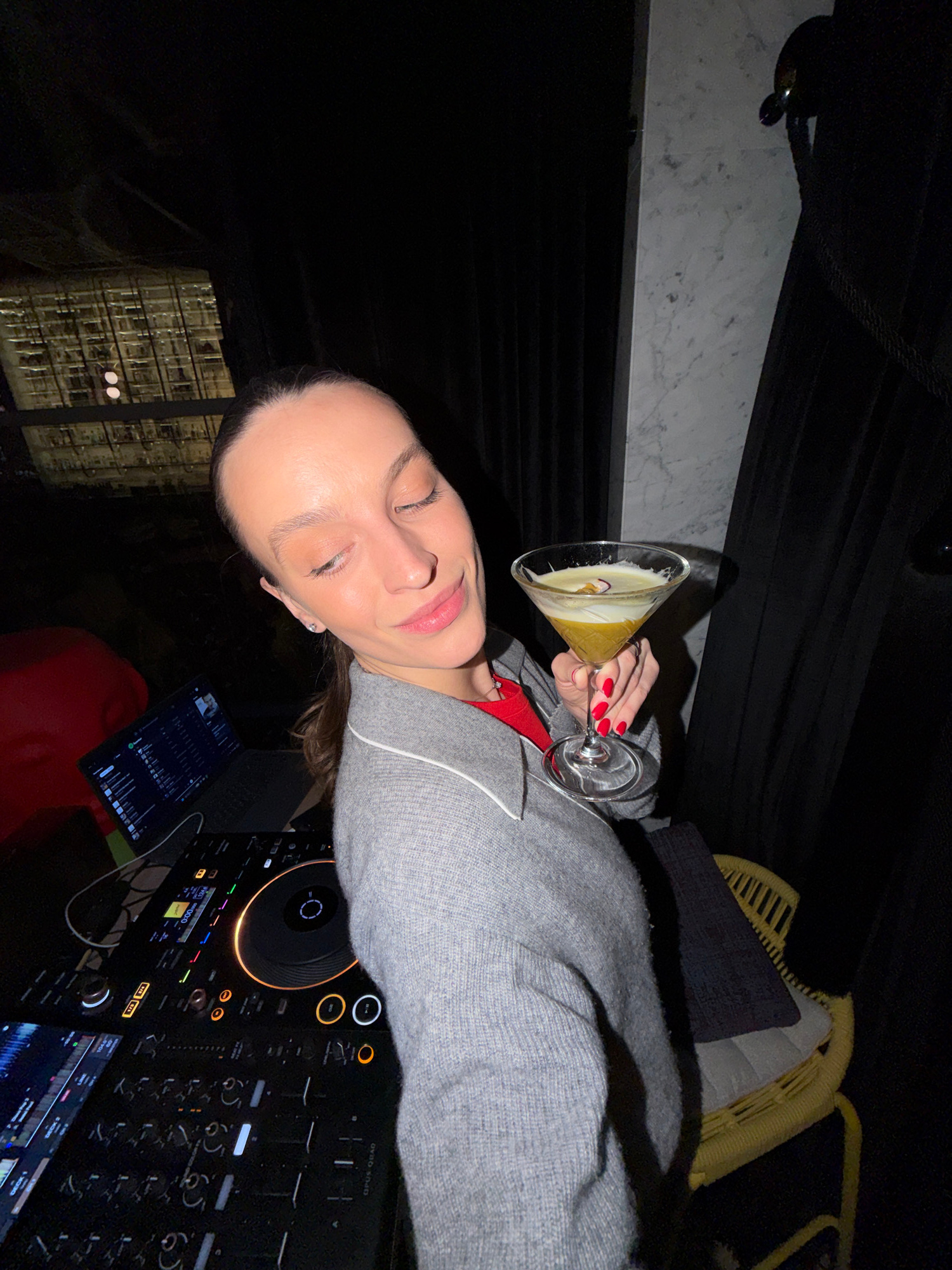A woman with closed eyes holds a martini glass filled with a yellow liquid in her right hand, while resting on a black DJ console with a laptop nearby. The woman wears a grey sweater with a red collar…read more