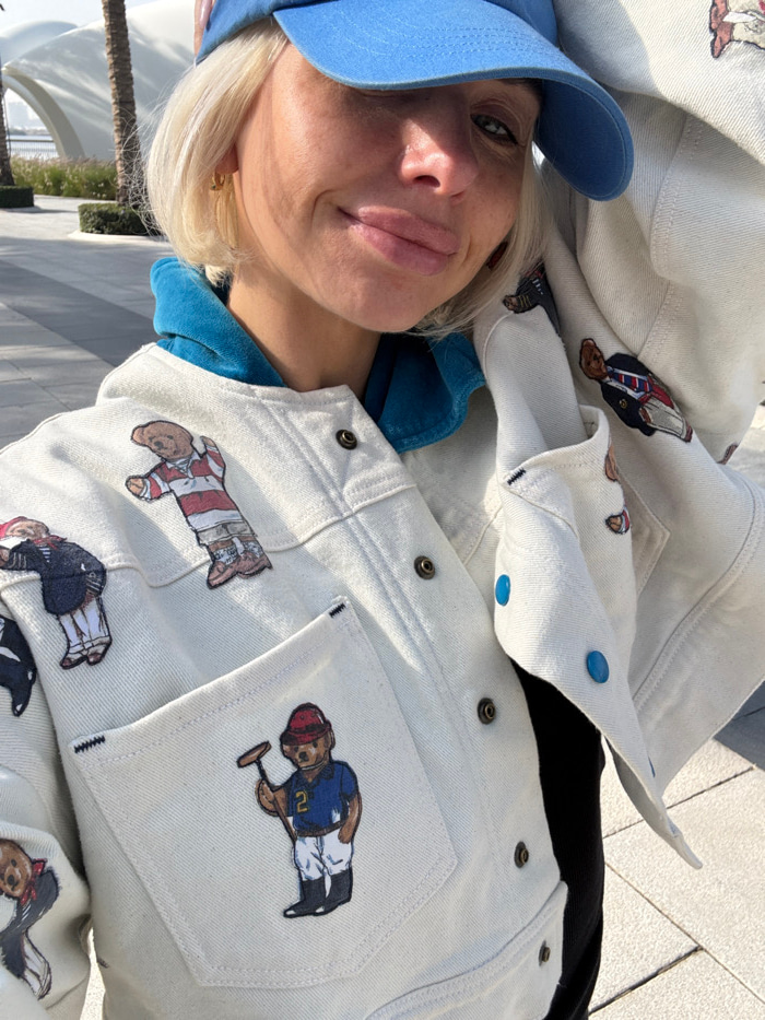 A woman with short blonde hair and a blue cap poses in front of two light-colored denim jackets. Each jacket has multiple patches of teddy bears dressed in various outfits. She wears a blue hoodie und…read more