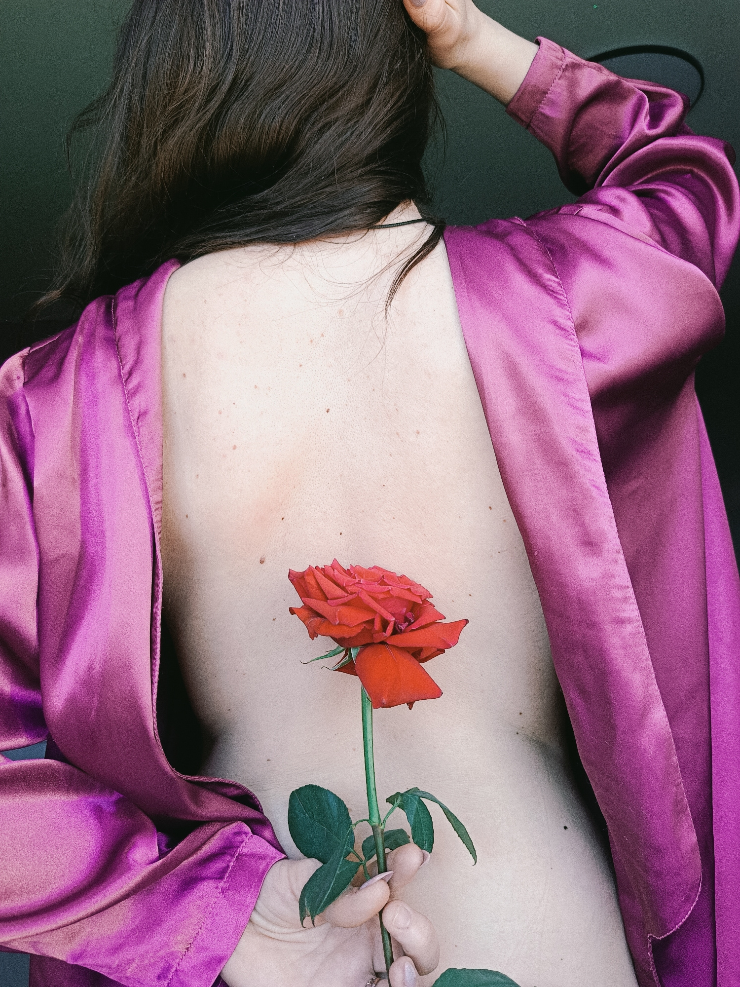 The image displays a person from behind, their bare back prominently featured. They are wearing a lustrous purple-magenta satin robe, which is draped over their shoulders and partially covering their…read more