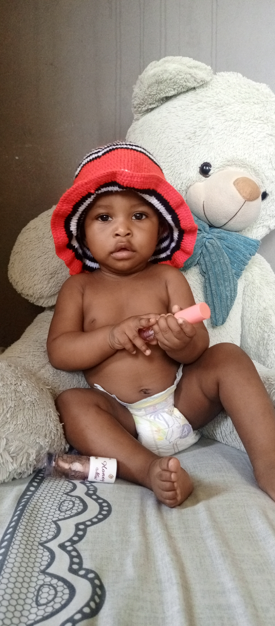 An indoor, vertical shot features a baby sitting in front of a large teddy bear. The infant, with dark skin, wears a colorful knitted bucket hat with red, black, and white stripes, and a light-colored…read more