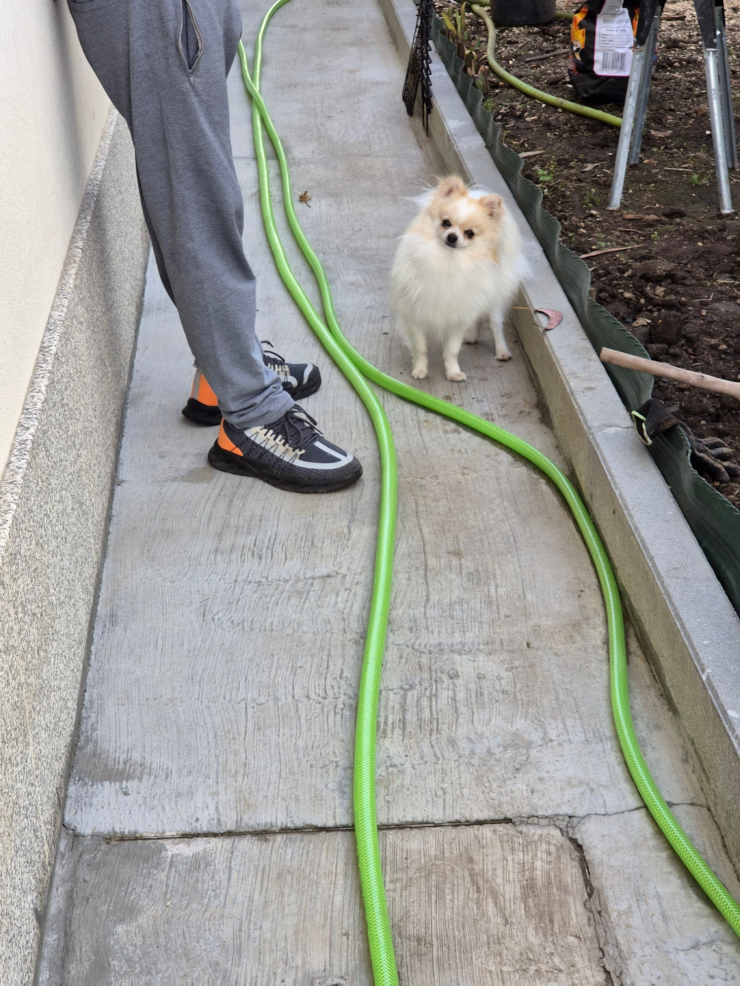A concrete patio abuts a dirt and vegetation-filled garden bed on a bright day. A small, fluffy, light-colored Pomeranian dog stands to the left of a leg clad in gray sweatpants and a black, white, an…read more