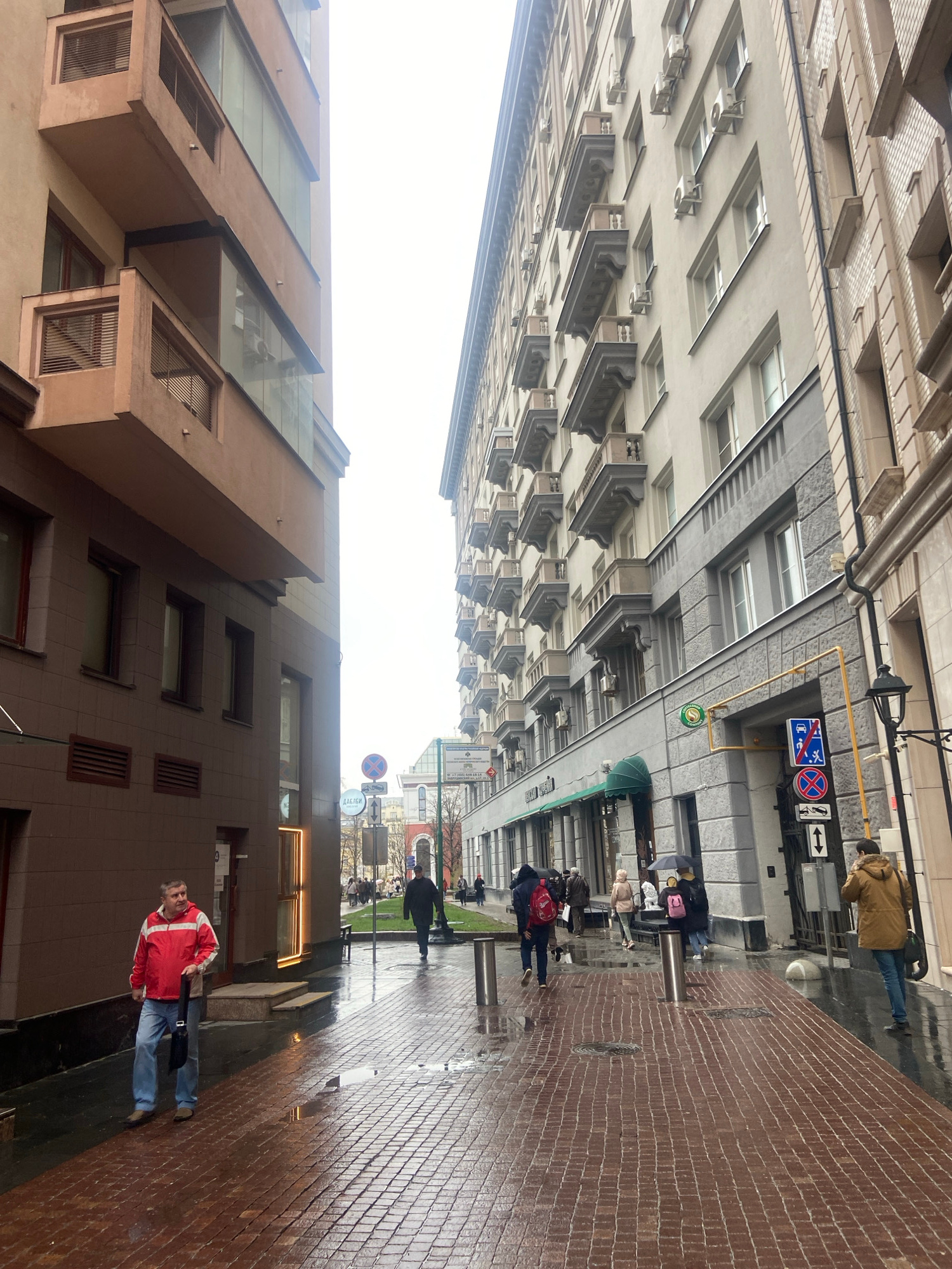 Here is a description of the image: The image shows a street scene in Moscow, Russia, taken on a wet day. The perspective is looking up between buildings on either side of the street. The buildings a…read more