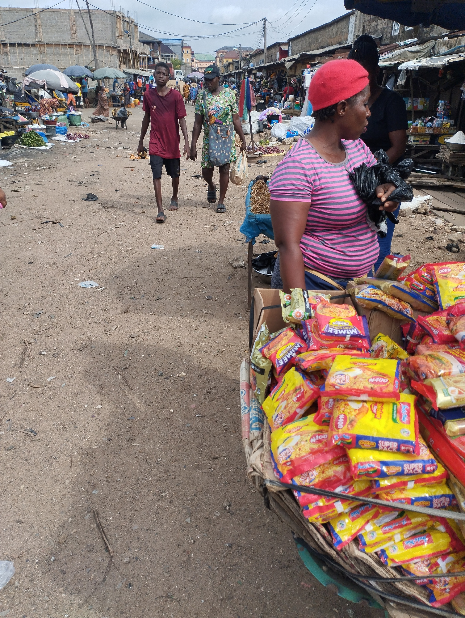 The image depicts a bustling street scene in Fegge, Nigeria. The ground is dirt and scattered with litter. A woman wearing a red beret and a pink striped shirt stands next to a cart overflowing with pβ¦read more