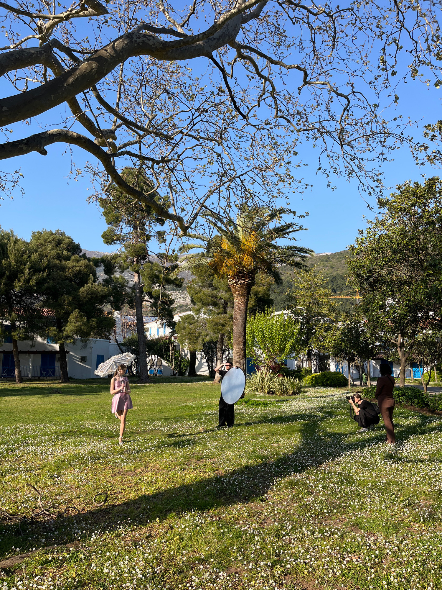 In Budva, Montenegro, an outdoor scene unfolds on a grassy lawn dotted with small white flowers. A young girl in a pink dress stands with a white parasol, while a photographer kneels nearby, taking pi…read more