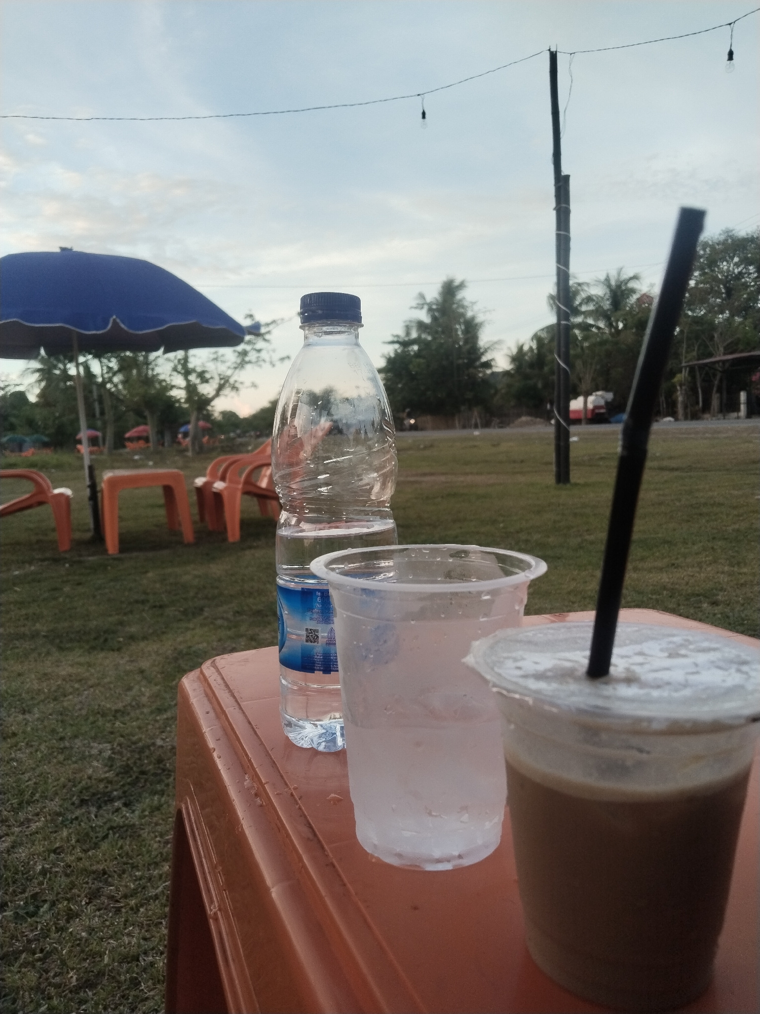 The image shows a close-up of a plastic table on a grassy surface, likely outdoors in Glokaron, Indonesia. On the table are three beverage containers: a partially empty bottle of water, a clear plasti…read more