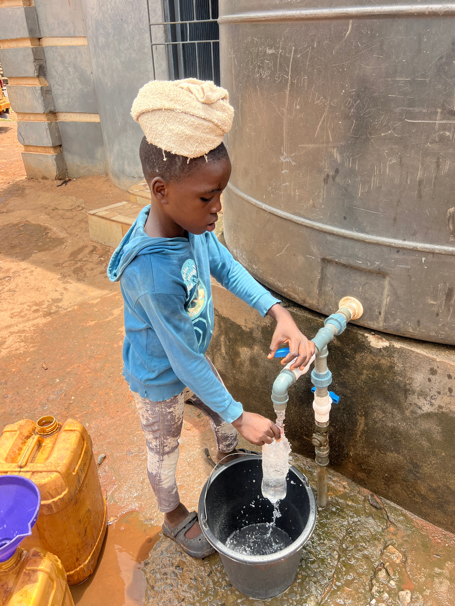 A young person with a beige towel on their head is filling a black bucket with water from a PVC pipe with multiple valves and joints connected to a large gray water tank. The person is wearing a blue…read more