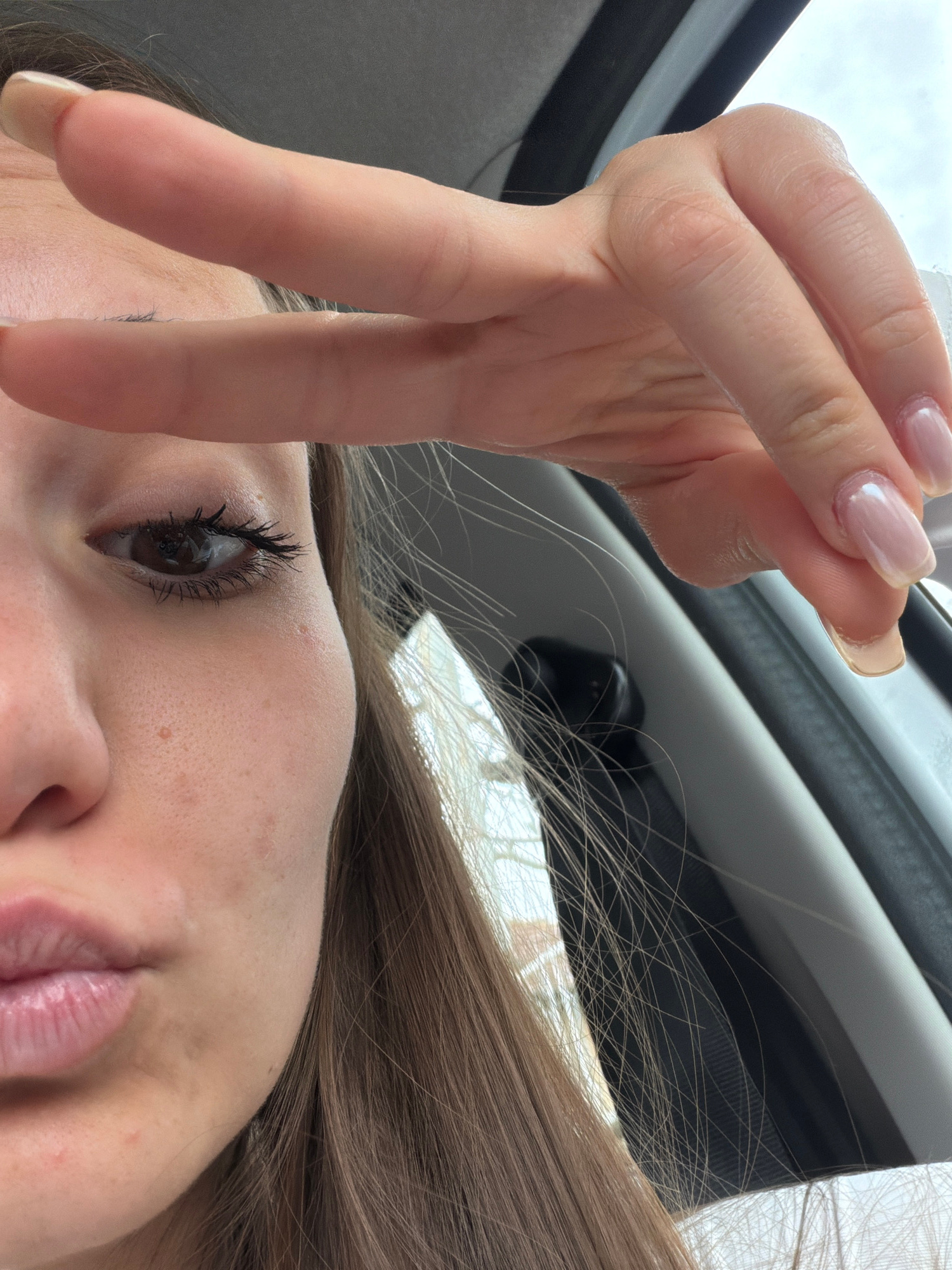 A close-up, low-angle photograph depicts a fair-skinned individual with light brown hair. The person's right eye is visible, with dark mascara on the eyelashes. Their right hand, with manicured nails,…read more