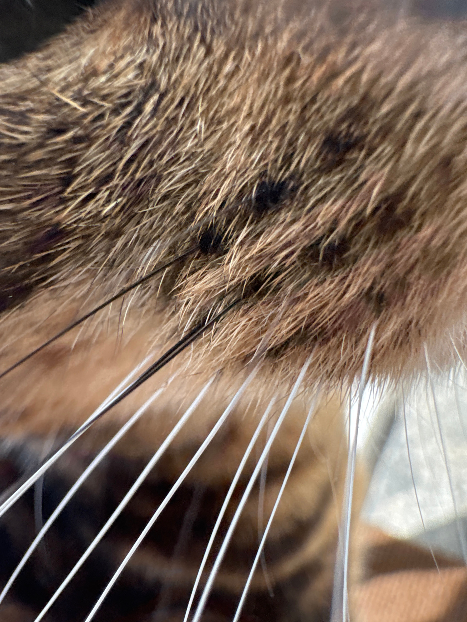 The image is a close-up of a tabby cat's fur and whiskers. The fur is primarily brown with darker and lighter strands mixed in. Several long, white whiskers extend outwards. A few dark whiskers are al…read more