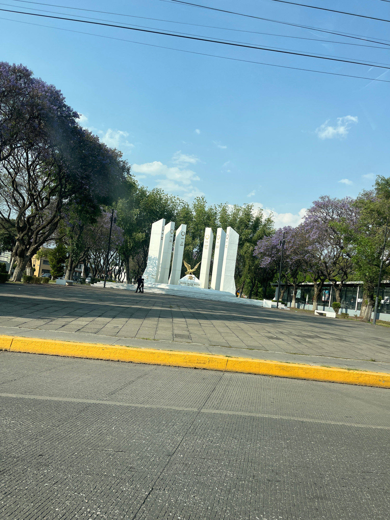 A daytime, eye-level shot shows a street scene in Puebla, Mexico. The camera is angled, creating a tilted perspective. On the left, electrical lines run along the sky above trees with purple blossoms.…read more