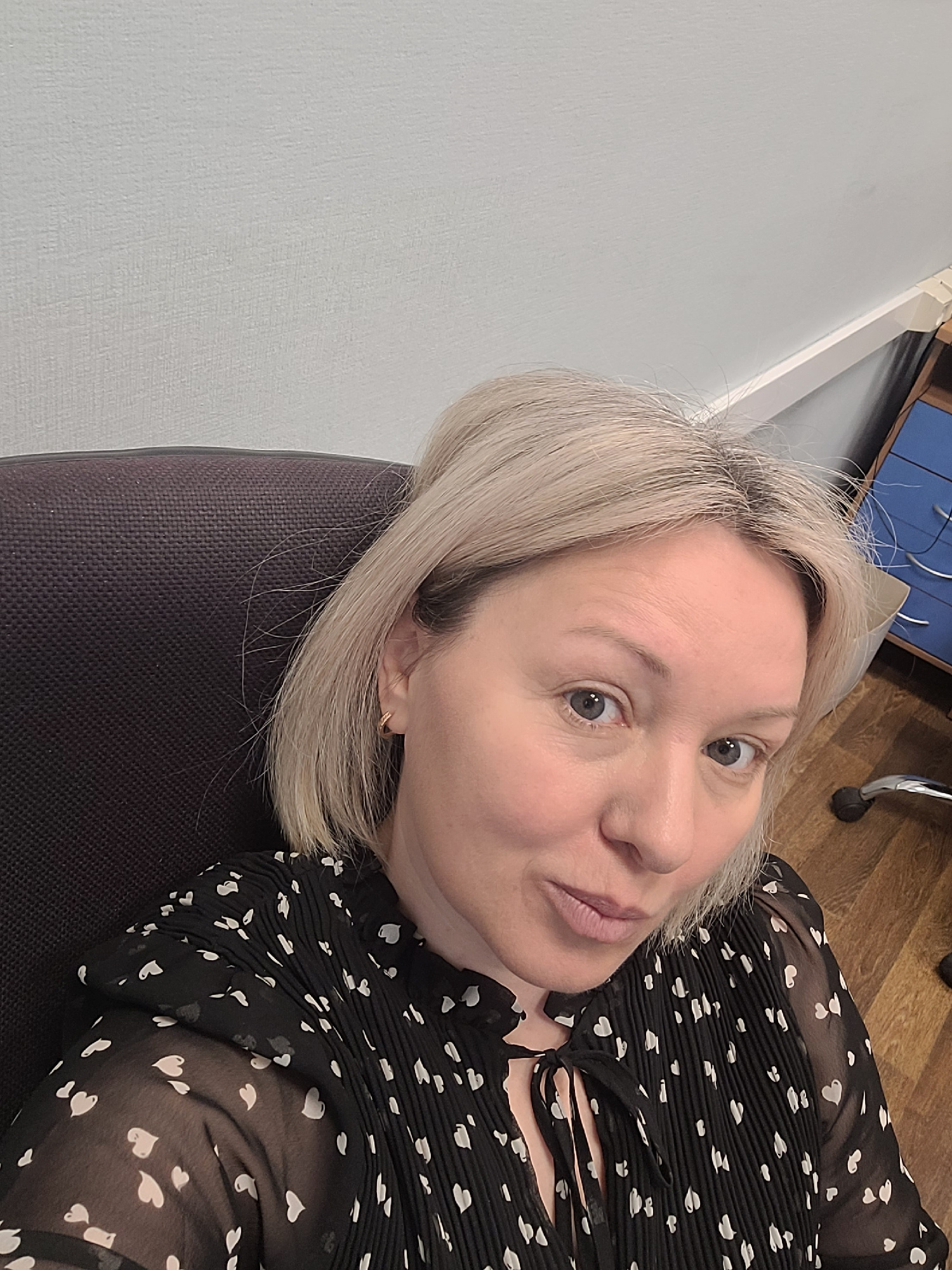 The image shows a fair-skinned woman with blonde, shoulder-length hair. She is wearing a black blouse with white heart patterns. She is seated in a dark gray chair. The background includes a light gra…read more