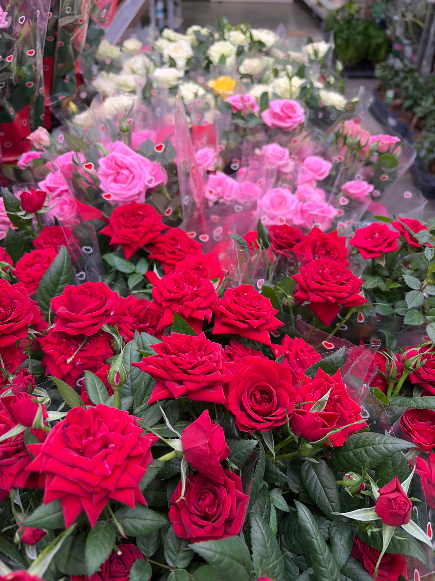 The image shows multiple bouquets of roses in a flower shop, likely in Izhevsk, Russia. From left to right, the bouquets are: white roses, pink roses, and red roses. Each bouquet is wrapped in clear c…read more