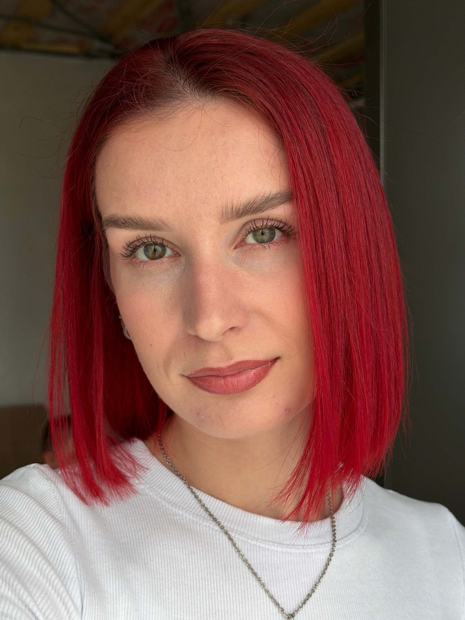A close-up, rotated image depicts a woman with fair skin and dyed, short, bright red hair. She has light-colored eyes with visible eyelashes and eyebrows. She wears a white ribbed shirt. A silver chai…read more