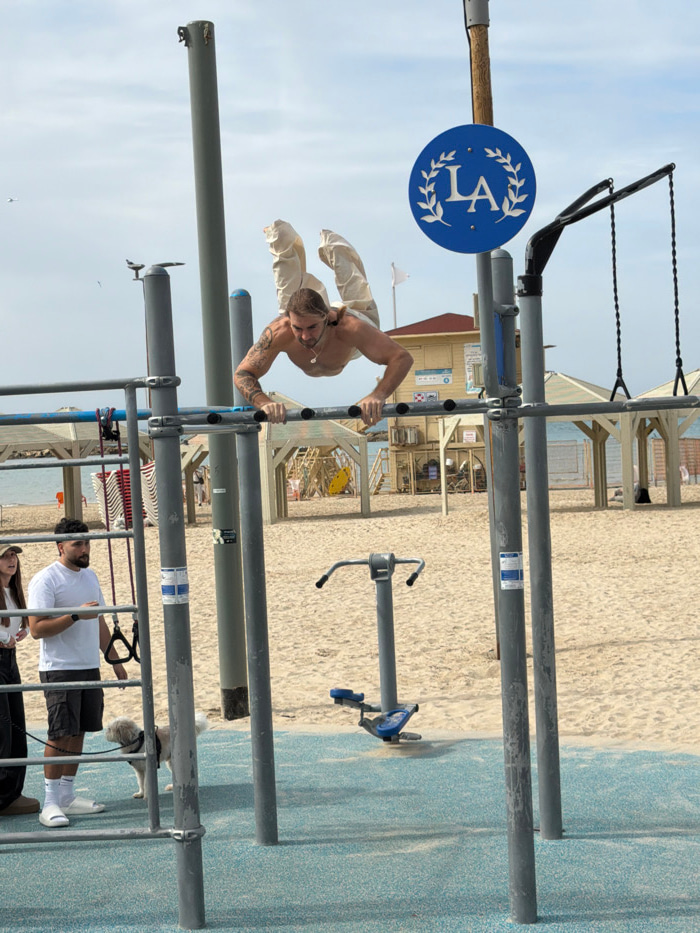 This image depicts an outdoor calisthenics gym situated on a public beach in Tel-Aviv, Israel. In the foreground, a shirtless, light-skinned male with visible arm and chest tattoos and blonde/light b…read more