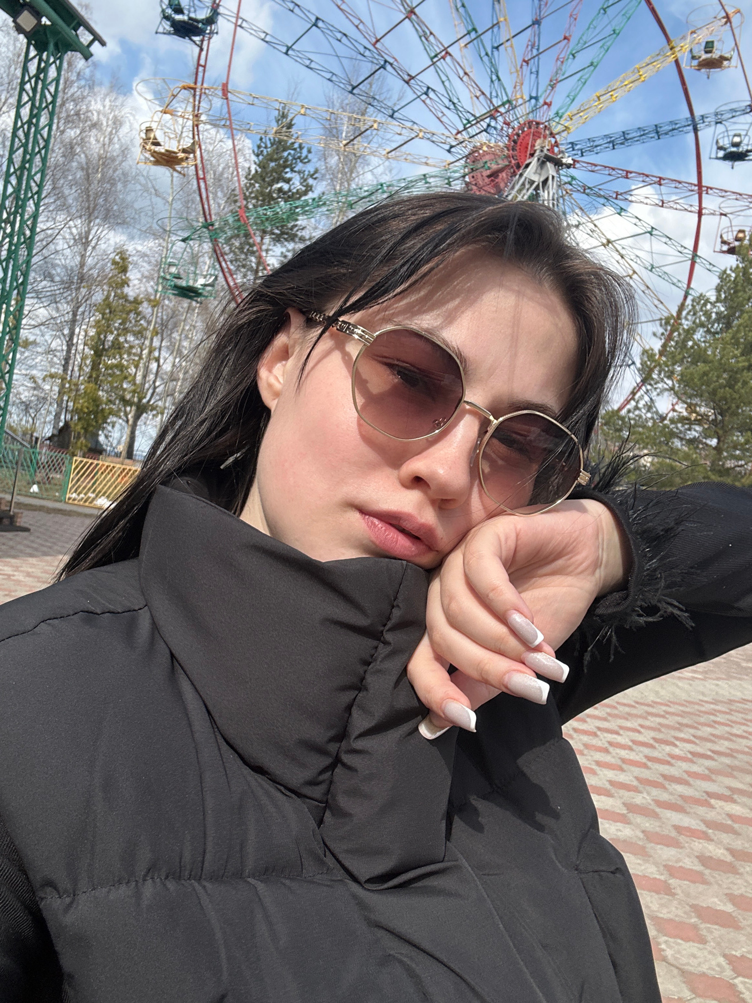 A medium close-up, eye-level shot features a young woman posing for a selfie in an outdoor setting, likely an amusement park in Chaikovsky, Russia. The woman, with dark hair, wears large, gold-framed,…read more
