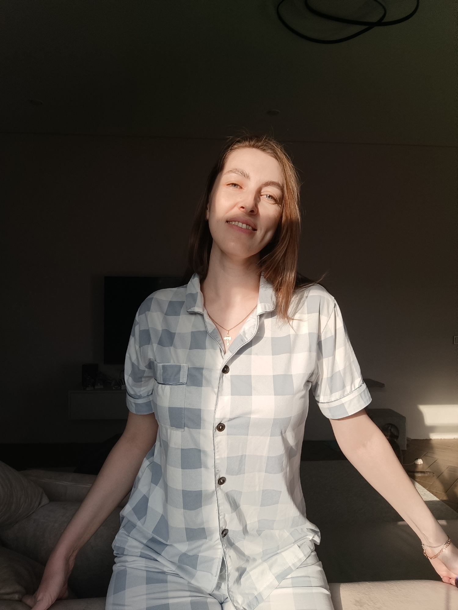 A woman with light skin and brown hair is sitting indoors, wearing a light blue and white checkered pajama set and a gold cross necklace. Her arms are outstretched. Behind her is a darkened room with…read more