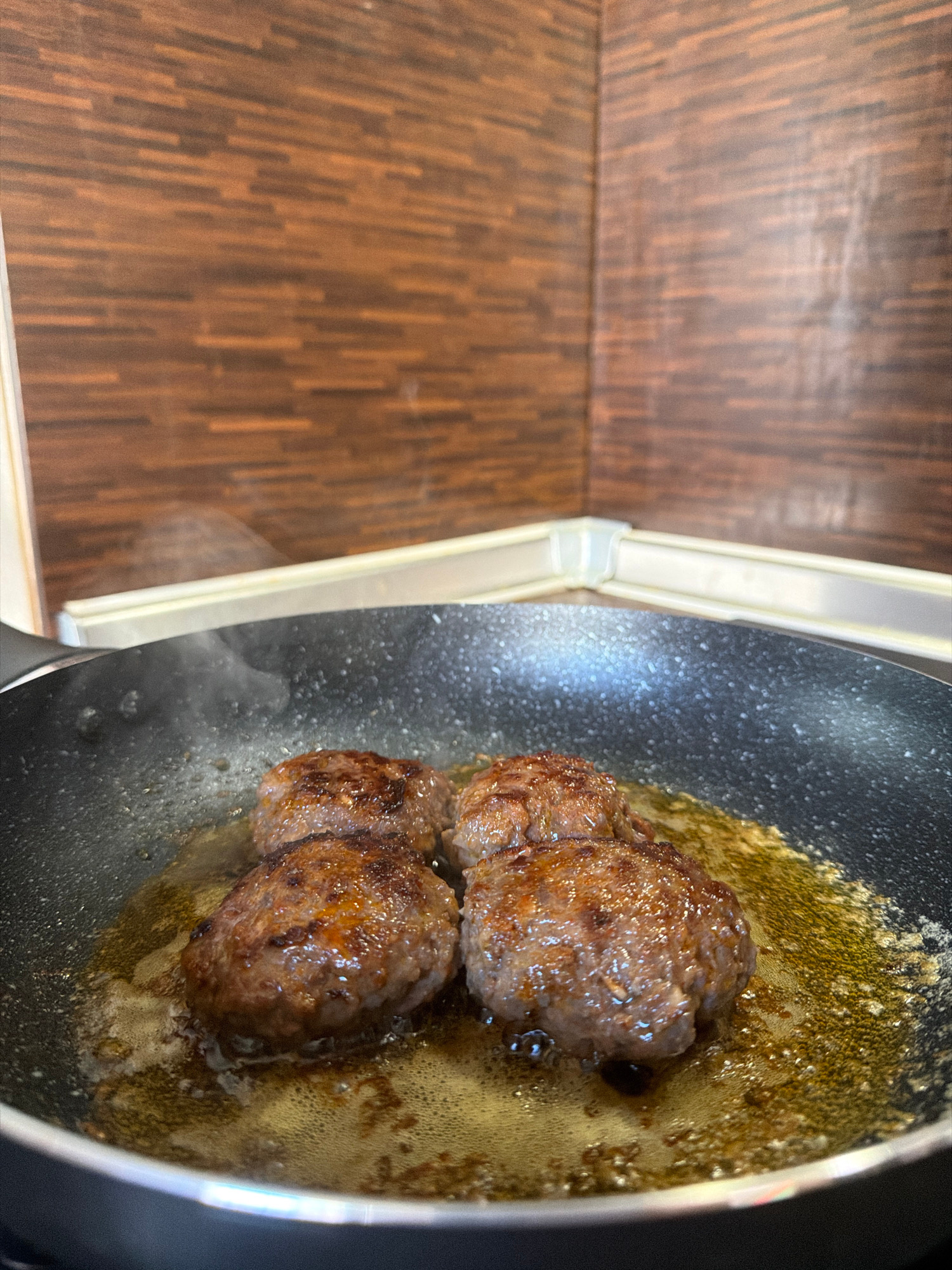 A close-up, high-angle shot shows two browned meat patties cooking in a black frying pan. The patties, likely meatballs or small hamburger steaks, have a well-seared, dark brown surface with lighter,…read more