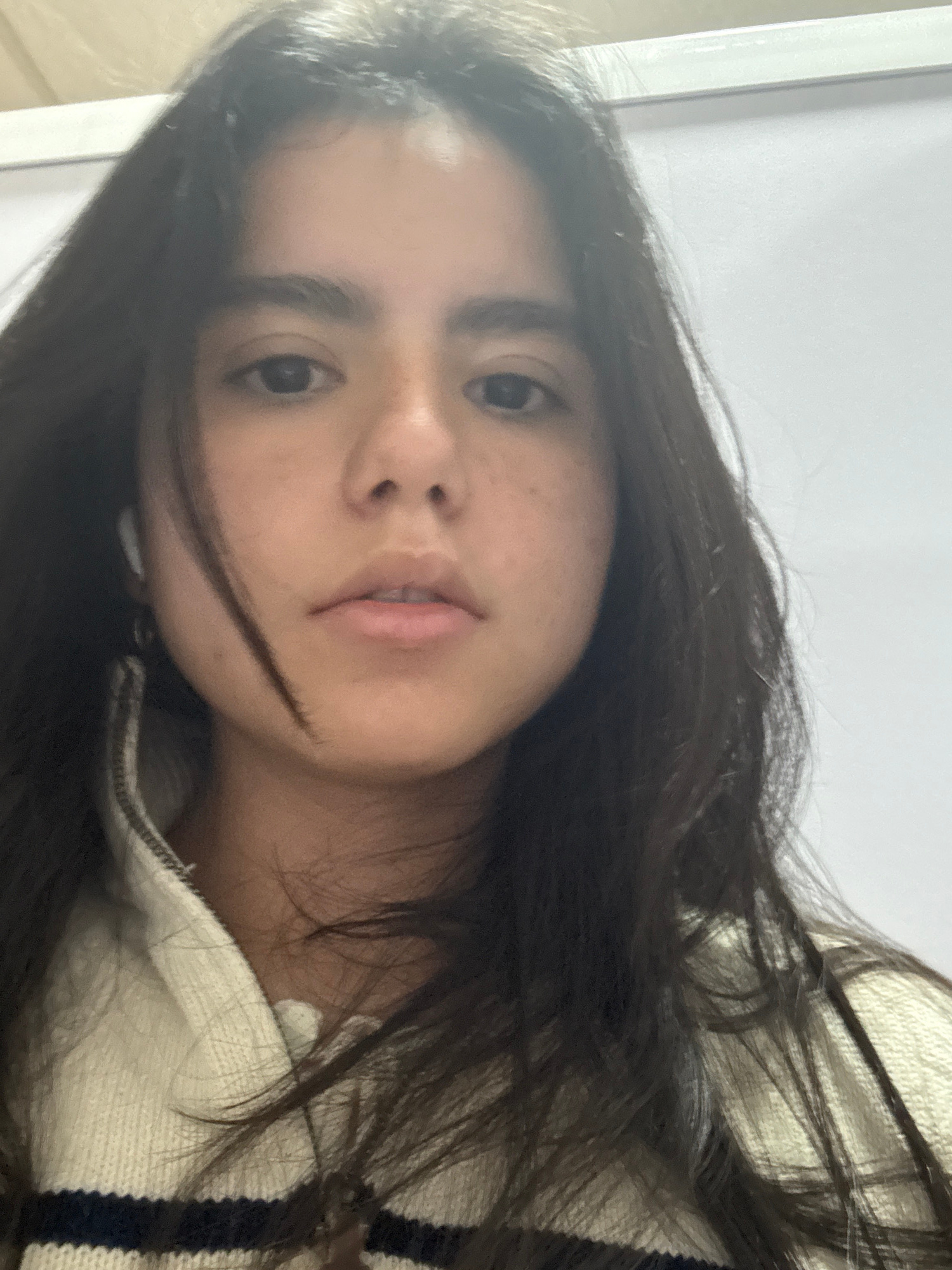 A close-up, slightly angled self-portrait of a young woman with dark hair. She has fair skin with some freckles. She is wearing a cream-colored sweater with dark blue stripes. A white object, possibly…read more