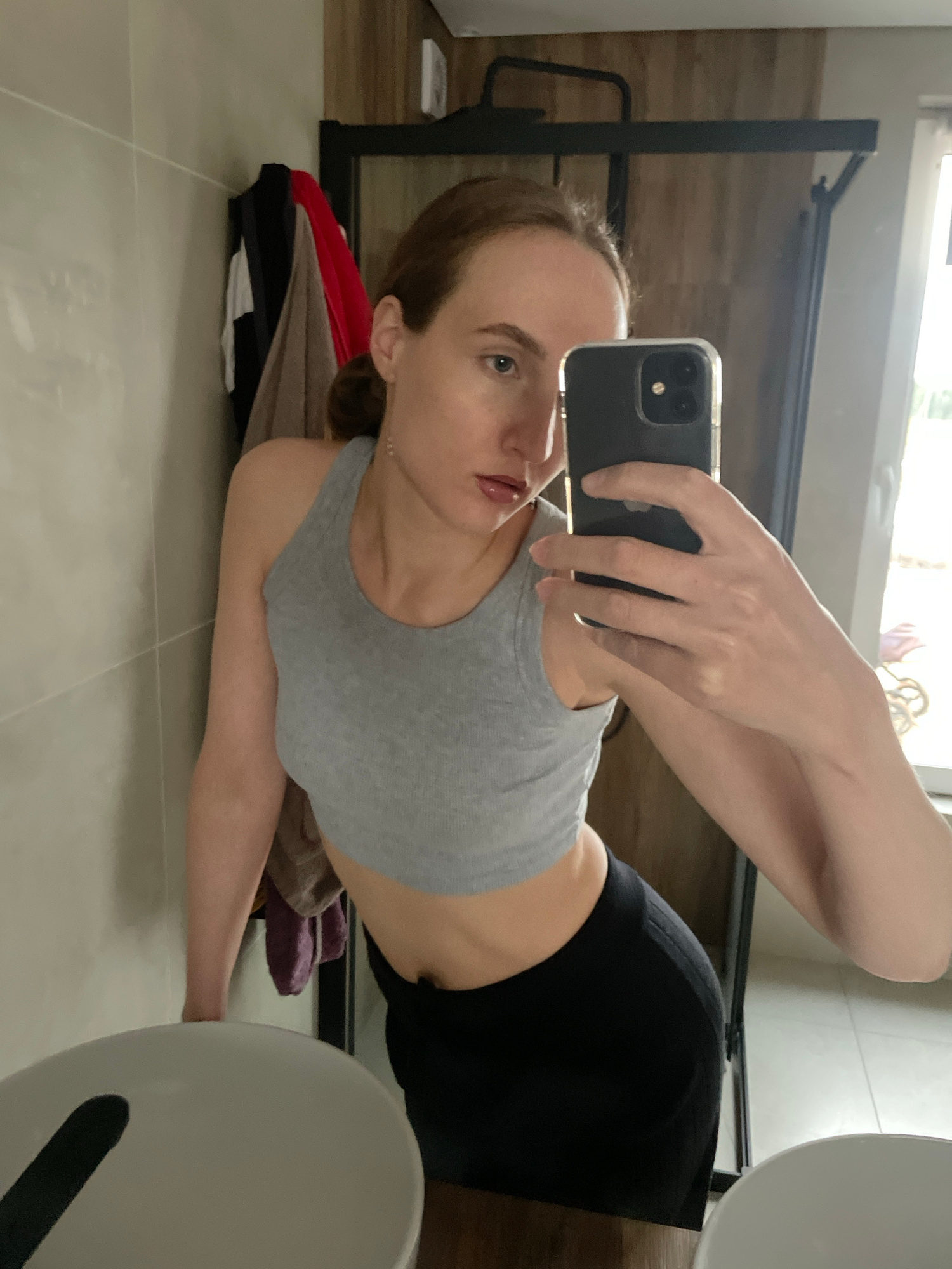 A woman is lying on a tiled floor in a bathroom, taking a selfie with a black smartphone. She is wearing a gray tank top and black shorts. Clutter, including clothing and towels, is scattered around h…read more