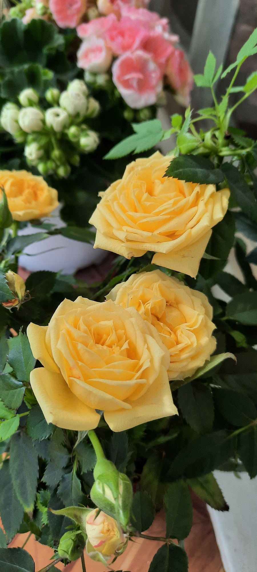 The image presents a close-up view of a floral arrangement. Three yellow roses dominate the central and right side of the image, their petals tightly layered and forming a compact bloom. Green leaves…read more
