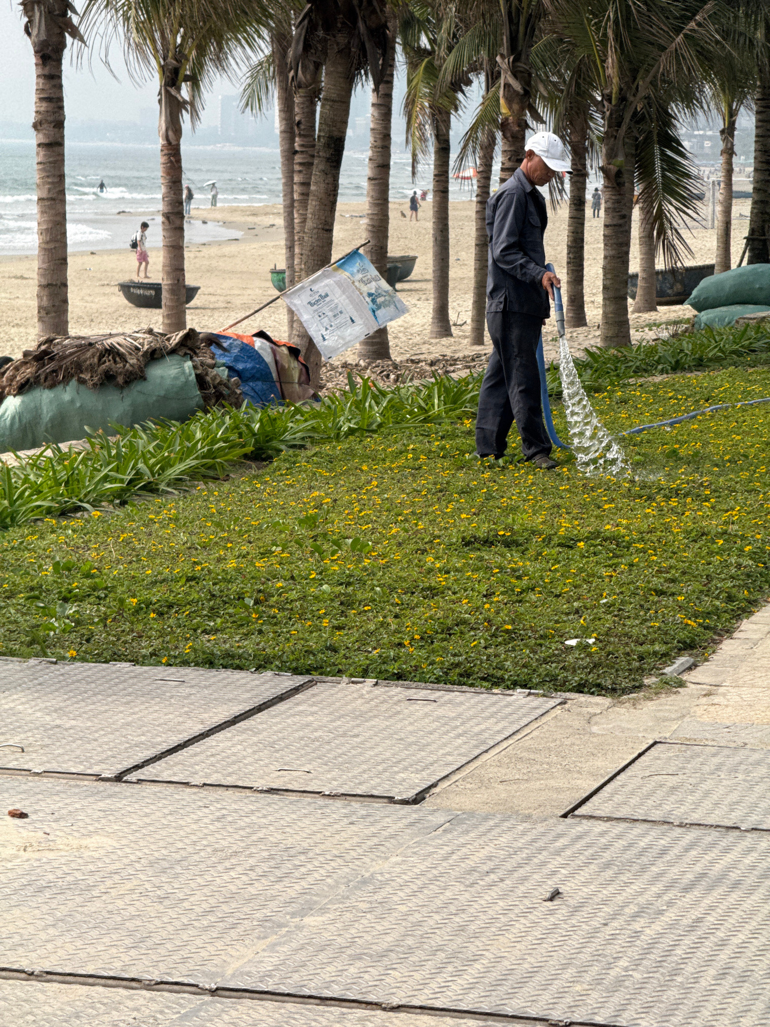 The image depicts a coastal scene at My Khe Beach in Đà Nẵng, Vietnam. In the immediate foreground, a light grey paved surface composed of interlocking metal plates with a diamond-plate pattern exten…read more