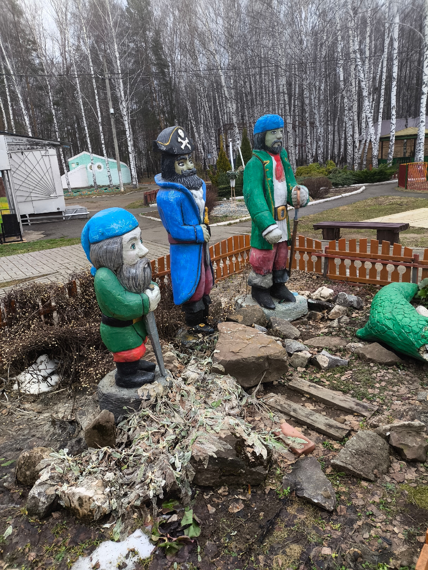 The image shows a small decorative garden in the city of Chaikovsky, Russia. Three painted concrete statues are visible: a gnome-like figure in green and blue, a pirate with a skull-and-crossbones hat…read more