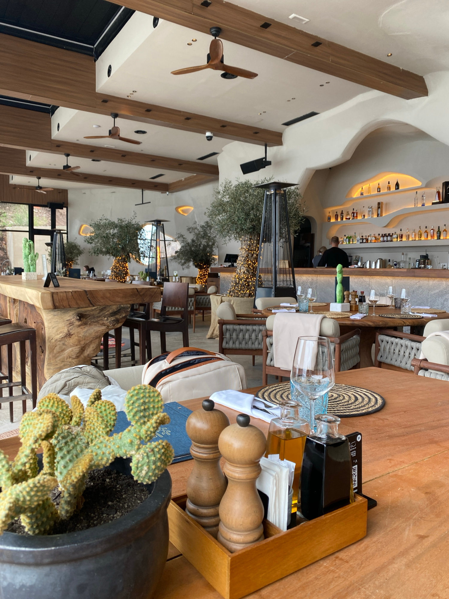 The image shows the interior of a restaurant in Sveti Stefan, Montenegro. The restaurant features a bar area with a display of bottles and a counter. There are tables set with glasses, napkins, and co…read more