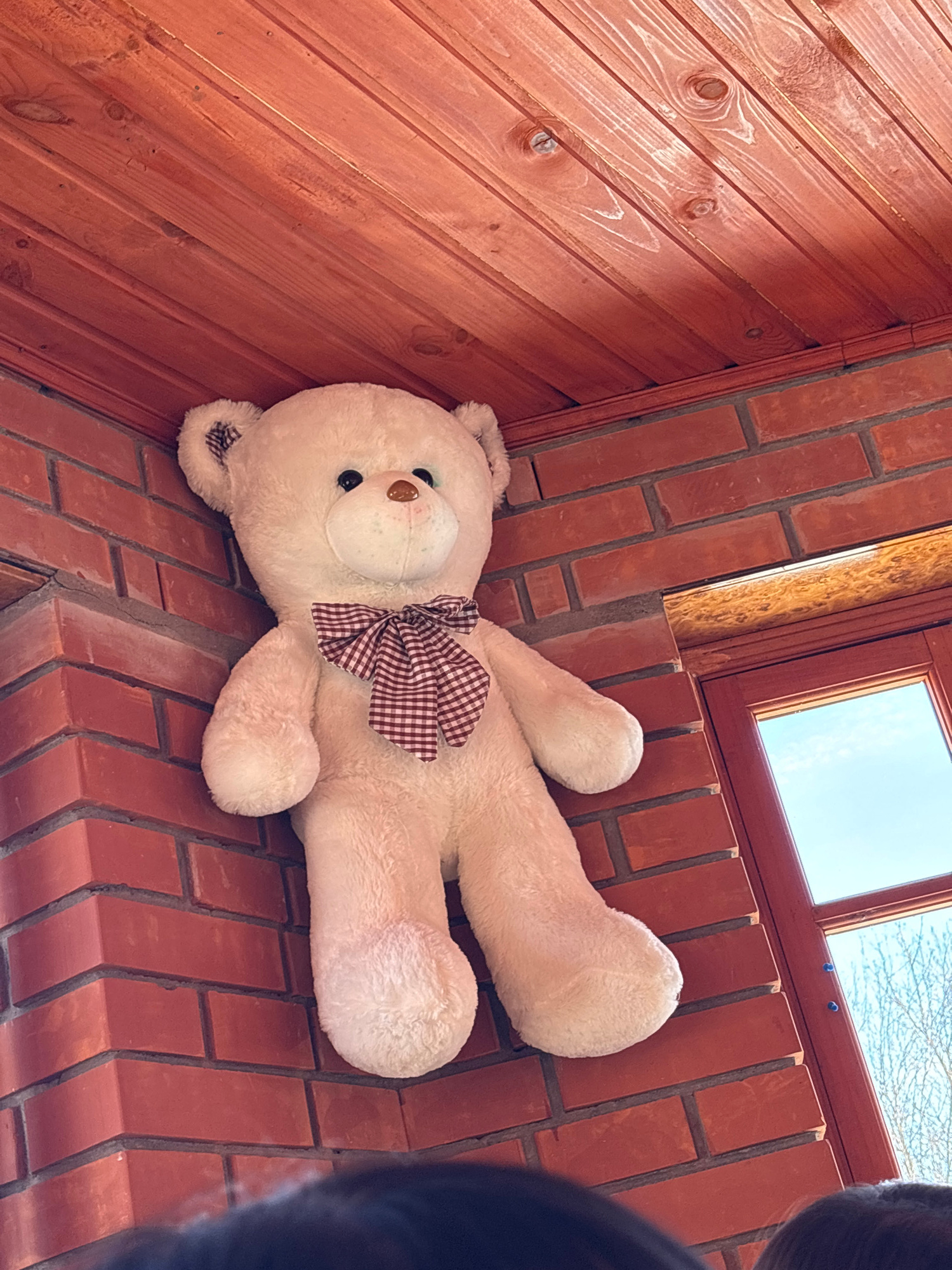 The scene, located indoors in the city of Ферма, Russia, depicts a large, pale cream-colored teddy bear positioned against a red brick wall. The bear features prominent black eyes, a light brown nose,…read more