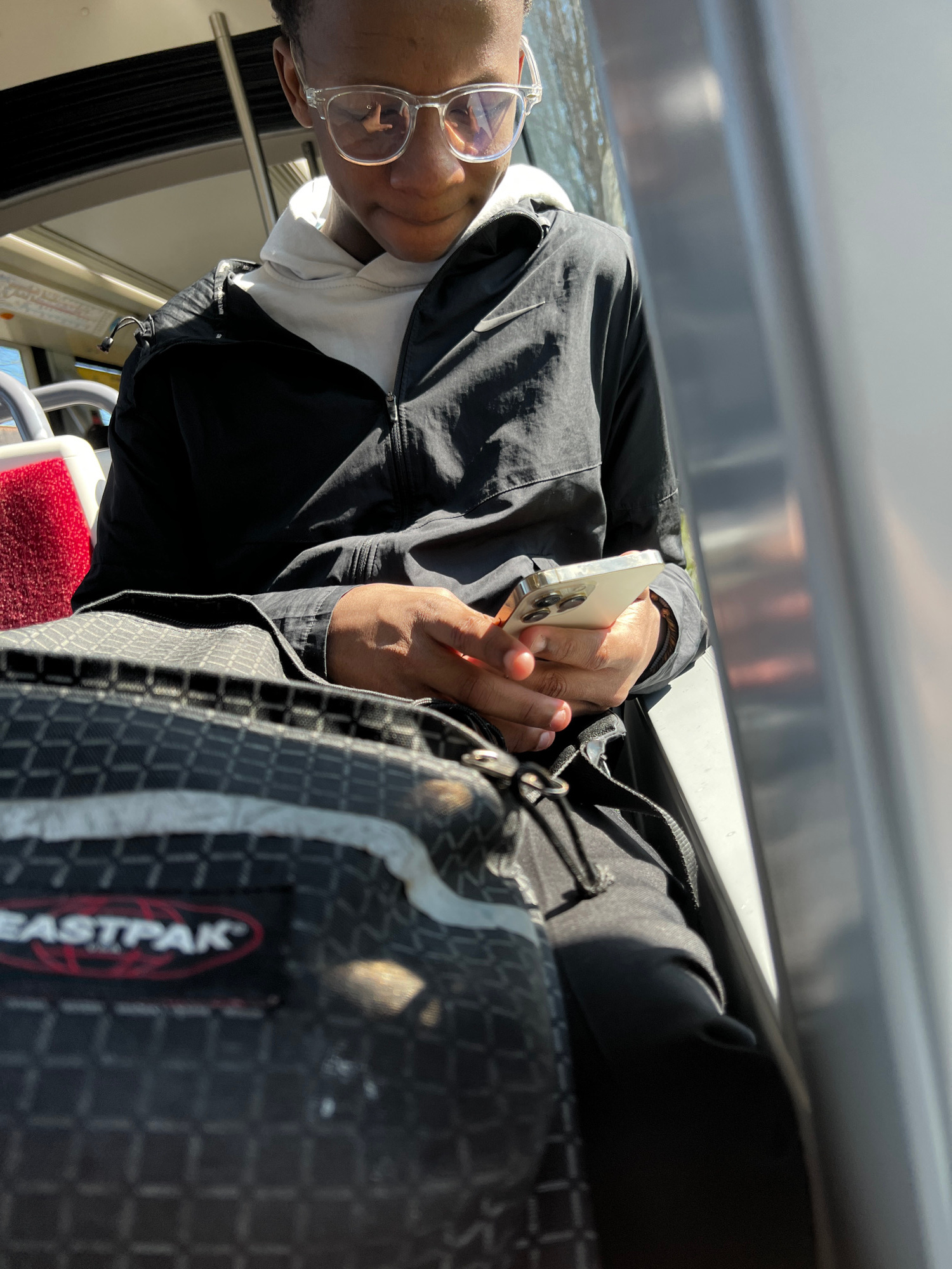 A person with glasses is sitting on a public transit vehicle, possibly a tram or bus. They are holding a smartphone in their hands and wearing a black jacket over a white hoodie. An Eastpak backpack i…read more