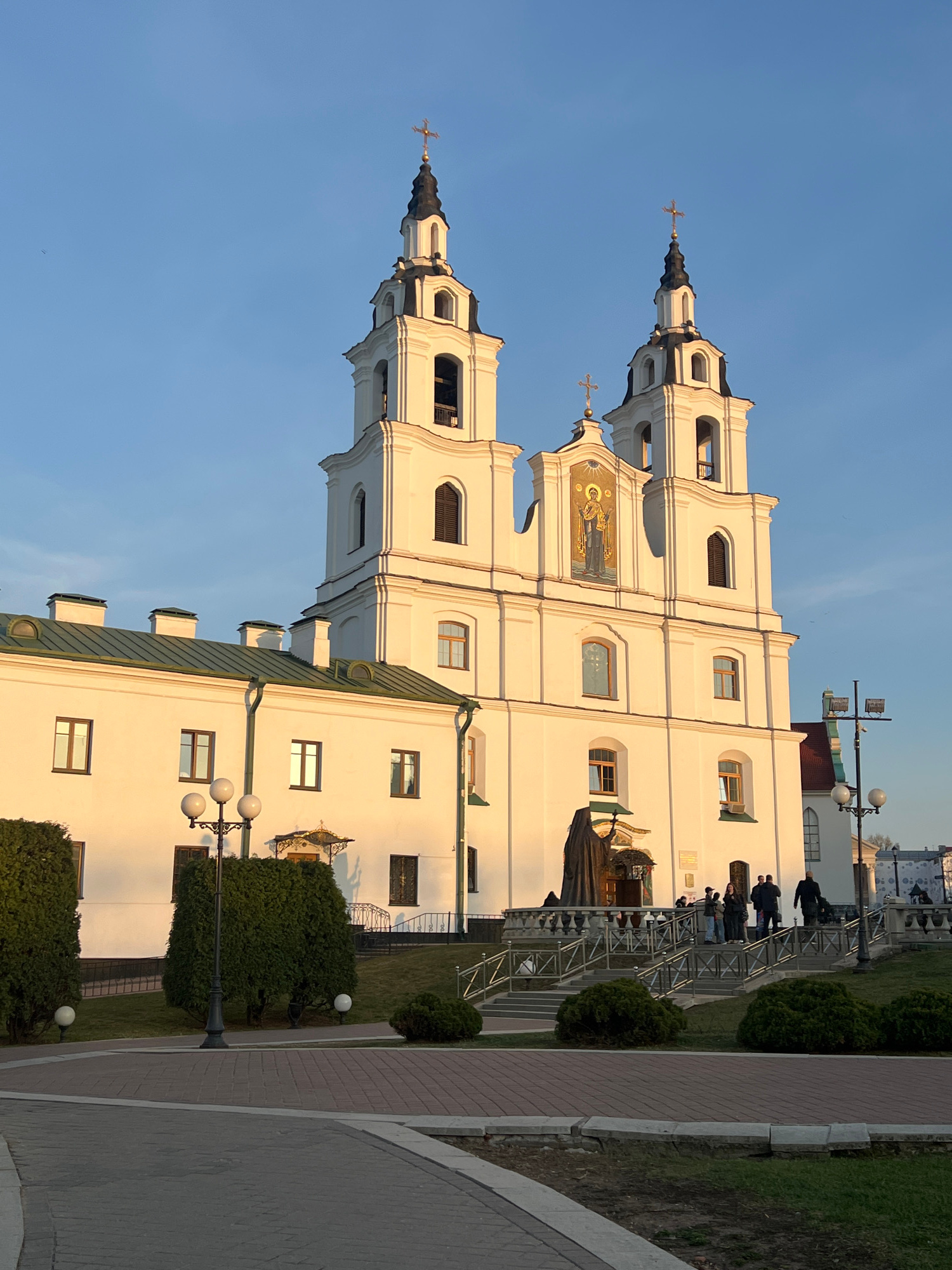 The image shows the Cathedral of the Holy Spirit in Minsk, Belarus, taken at an angle. The white cathedral features two towers topped with black conical roofs and gold crosses. The building’s facade h…read more