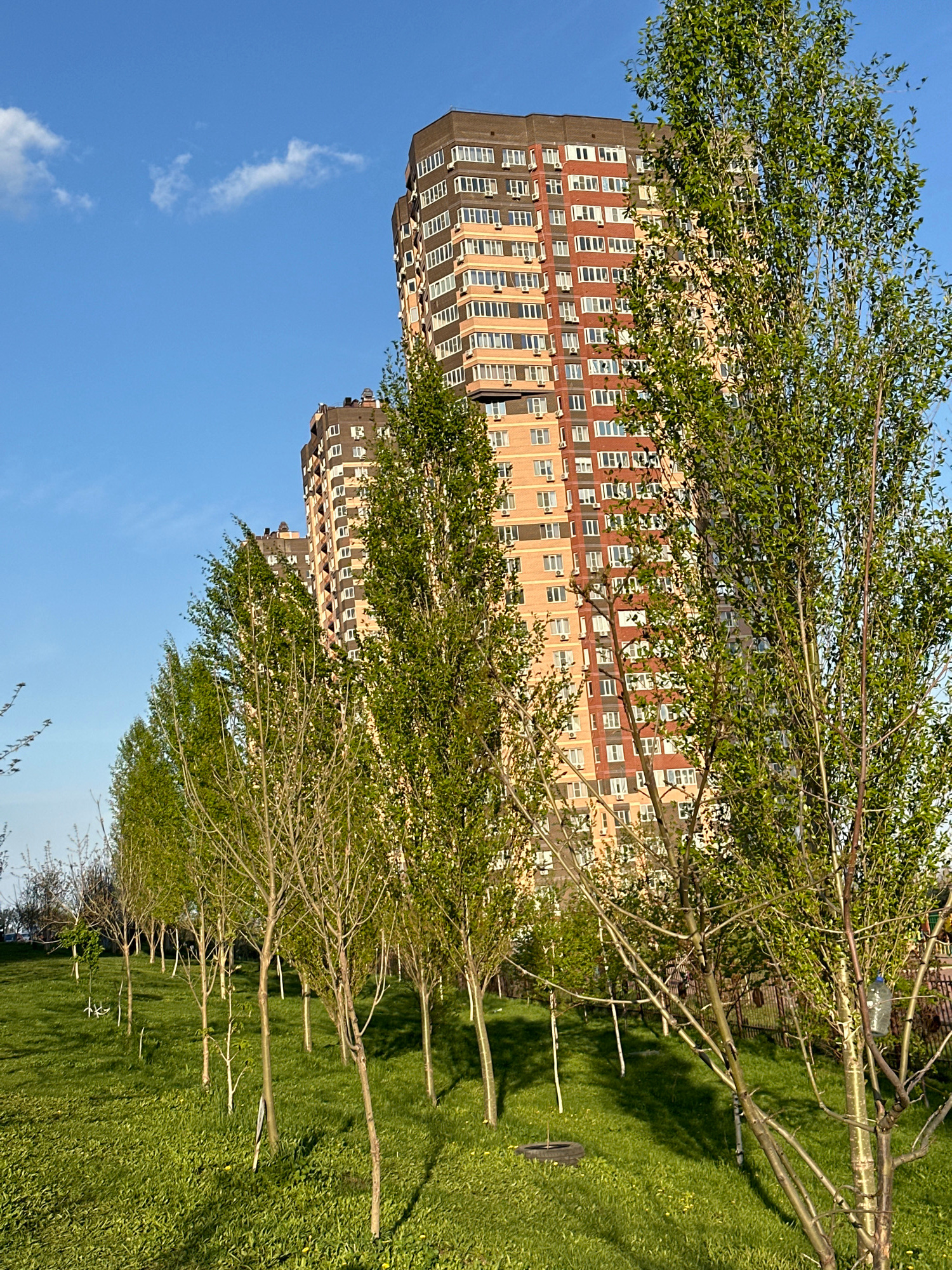 The image shows a view in Rostov-on-Don, Russia, featuring apartment buildings of approximately 12 stories, constructed of brick and concrete, visible behind a line of newly planted trees in a grassy…read more