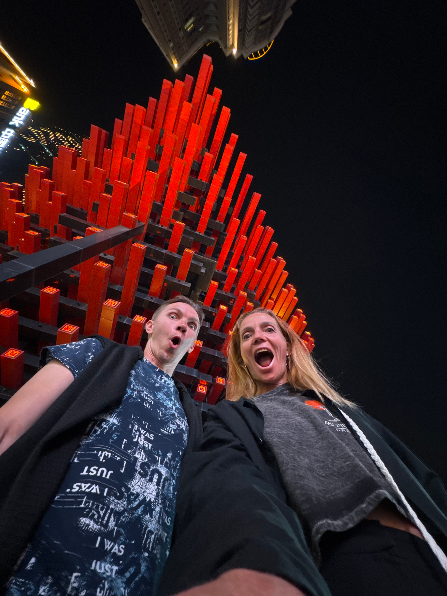 At night in Yuzhong District, China, two people, a fair-skinned woman with blonde hair and a fair-skinned man, are in the foreground looking up with exaggerated facial expressions in front of Hongyado…read more