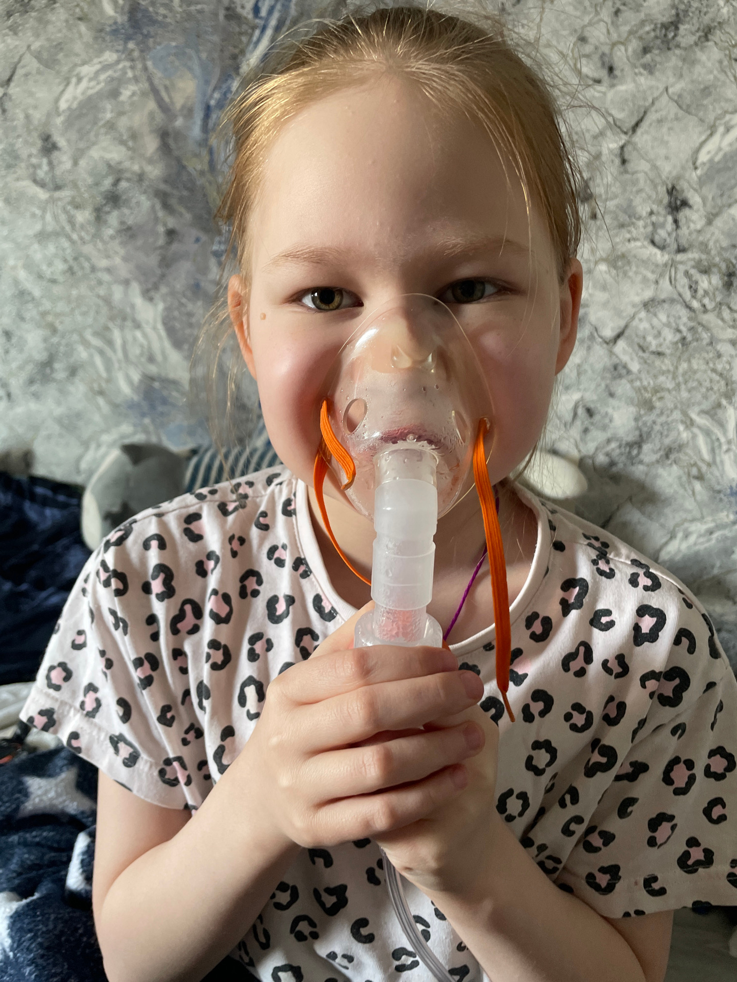 A young child with light blonde hair is shown from a top-down, slightly angled perspective, appearing to lie down in an indoor setting, likely on a bed or couch with a grey and blue patterned blanket.…read more