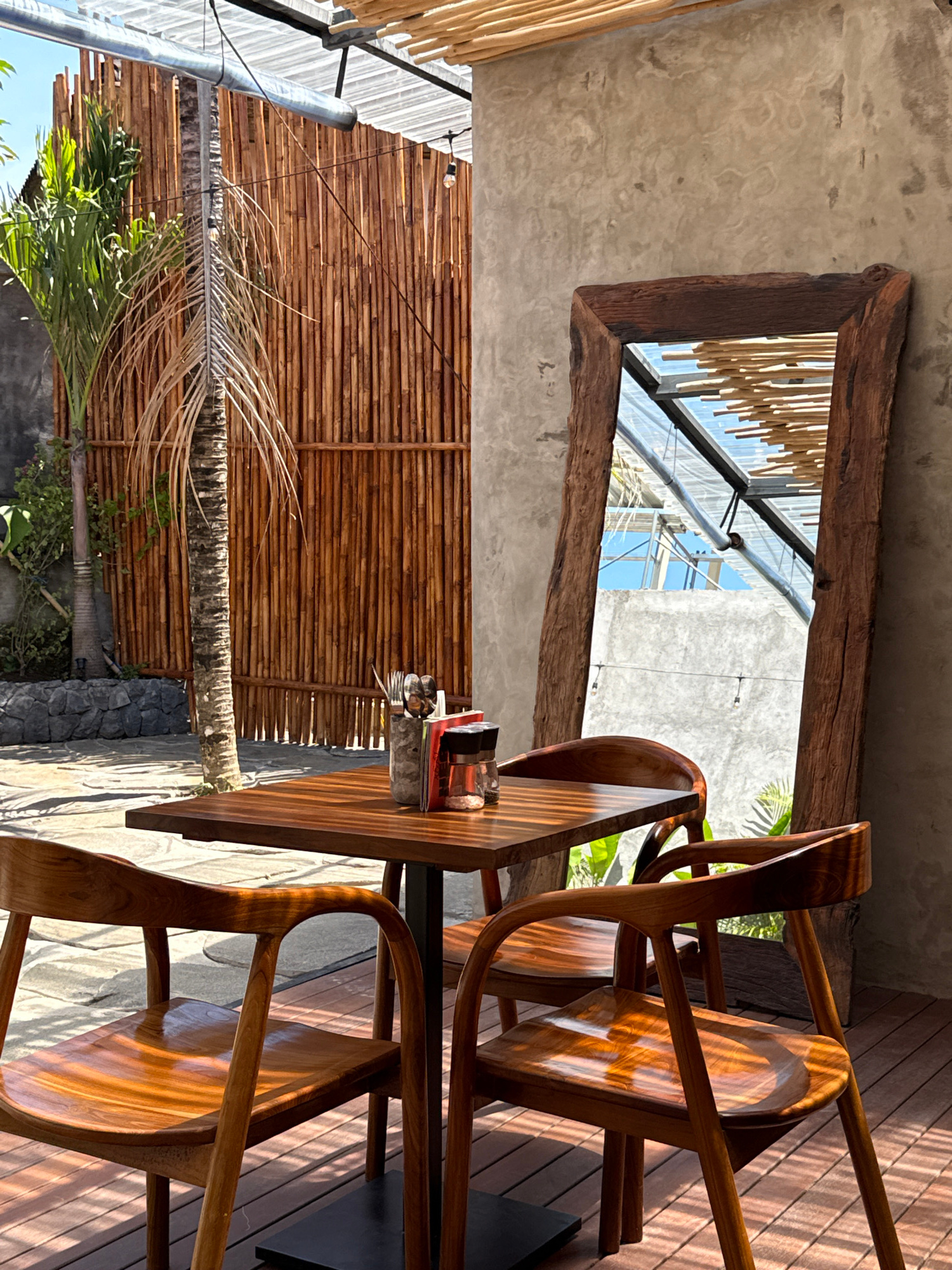 The scene is outdoors, appearing to be in a covered patio or cafe in Kuta Selatan, Indonesia. The setting includes wooden furniture, specifically a wooden table and chairs, positioned on a wooden deck…read more