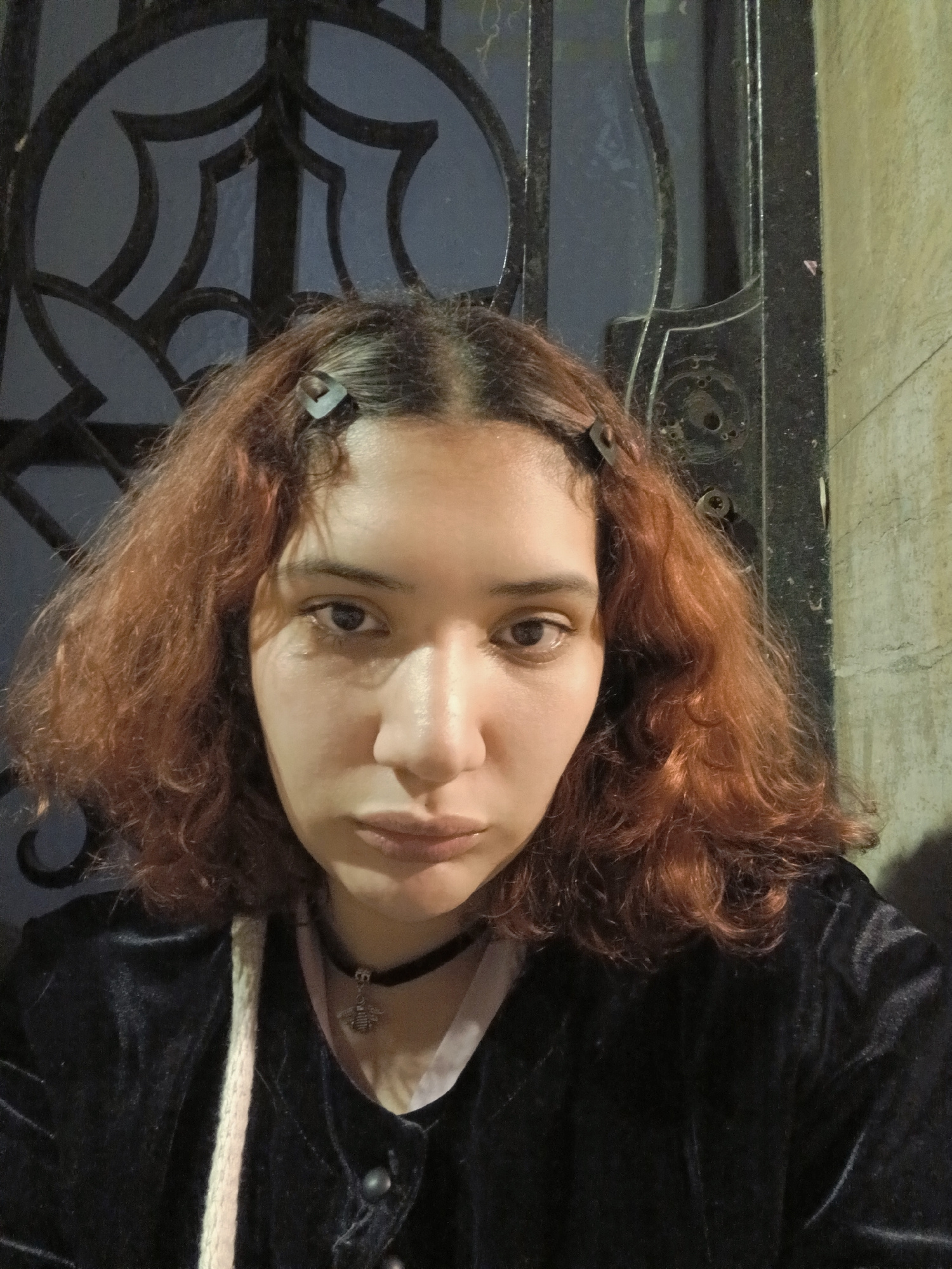 A young woman with reddish-brown, wavy hair is depicted in a head-and-shoulders portrait, her head tilted to one side as she gazes directly at the camera. Her expression is neutral and calm. Her brownβ¦read more