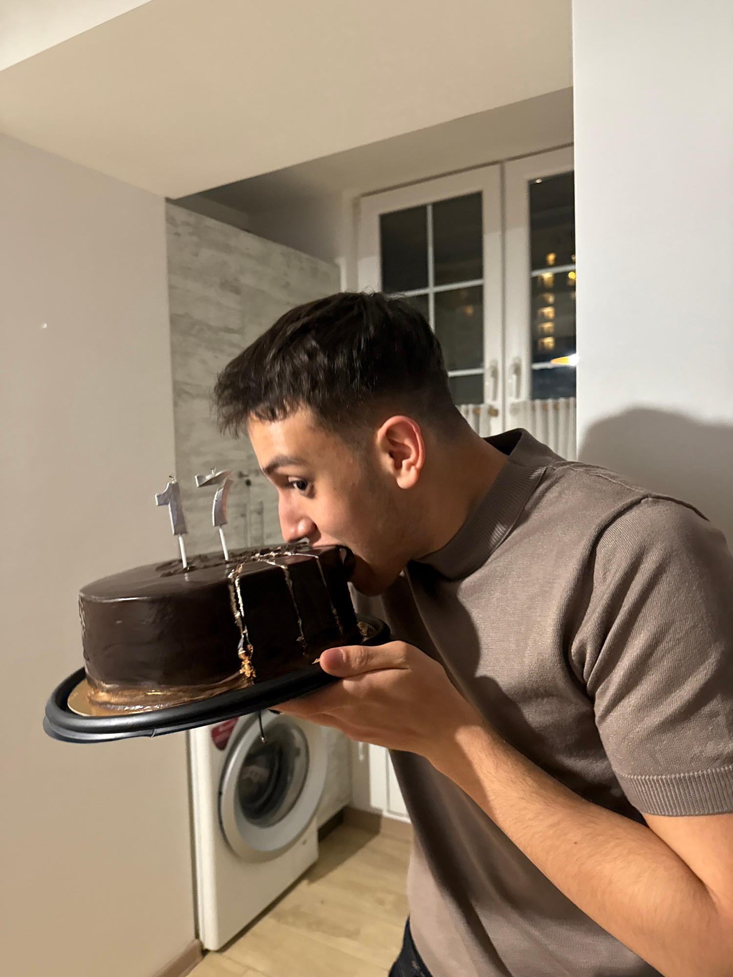 A man is holding a chocolate cake with candles in what appears to be a residential interior. A washing machine is visible in the background, suggesting a kitchen or utility area. Through a window, lig…read more