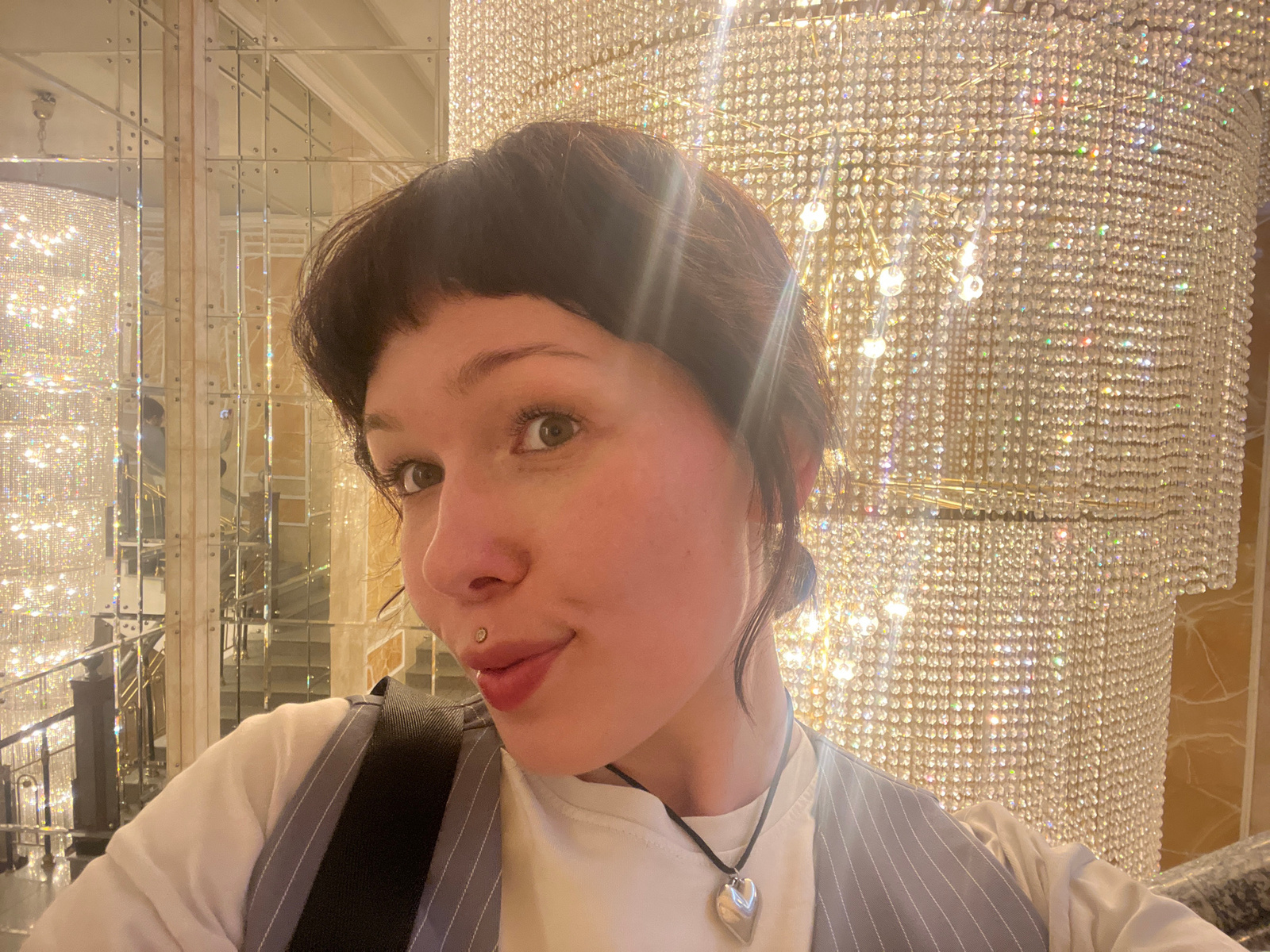 A person poses for a selfie while upside-down, in front of a large, ornate chandelier that appears to be in the lobby of a luxurious building in Kazan, Russia. The person, who appears to be female, we…read more