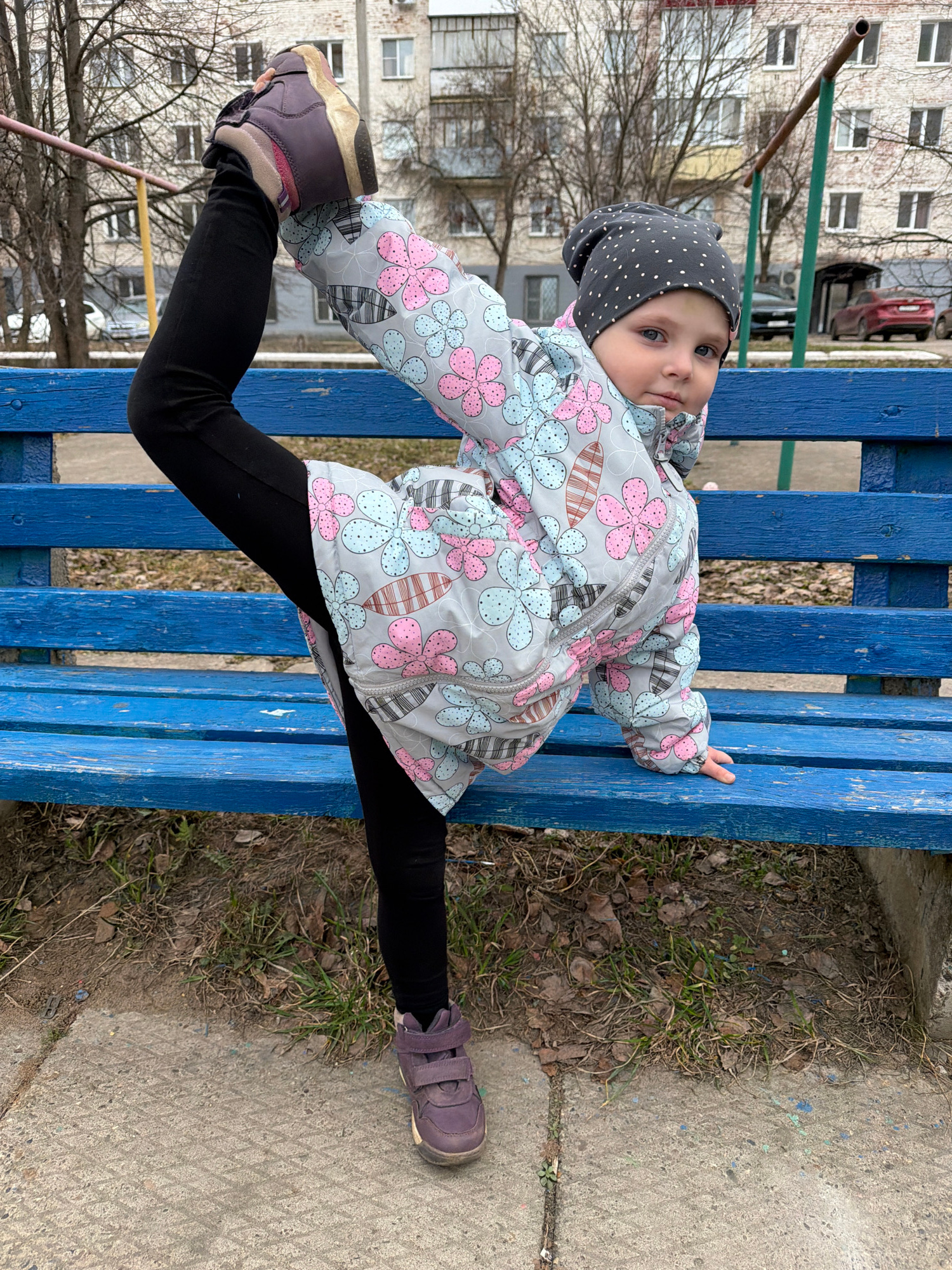 A young child is performing a split on a blue park bench. The child is wearing a grey polka-dot hat, a grey jacket with pink and blue flowers, black leggings, and purple shoes. The bench is located ou…read more