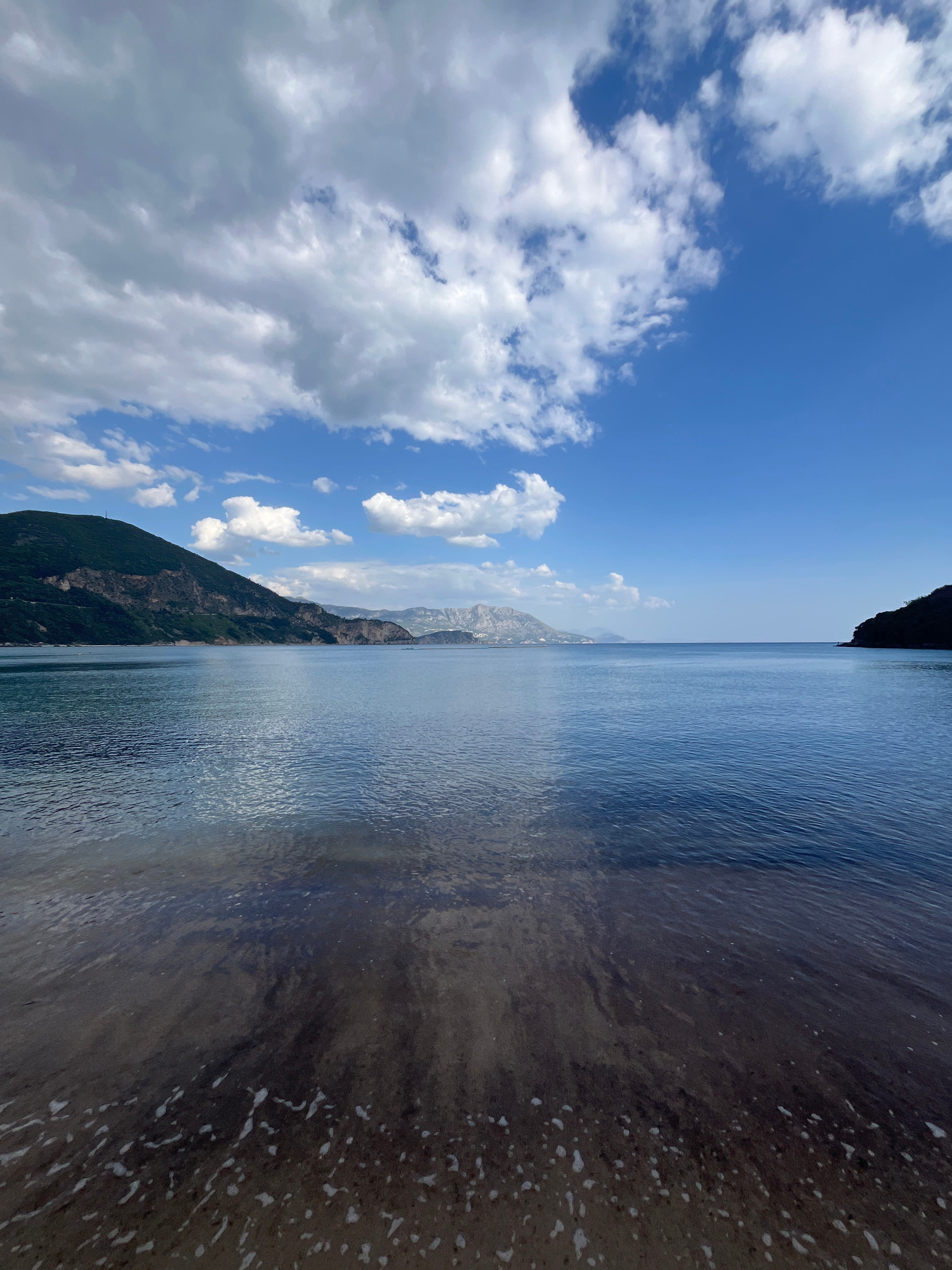 This media file captures a serene horizontal landscape, depicting a vast body of water, likely a bay or lake, framed by mountains under a bright sky. Given the location context of Prijevor, Montenegro…read more