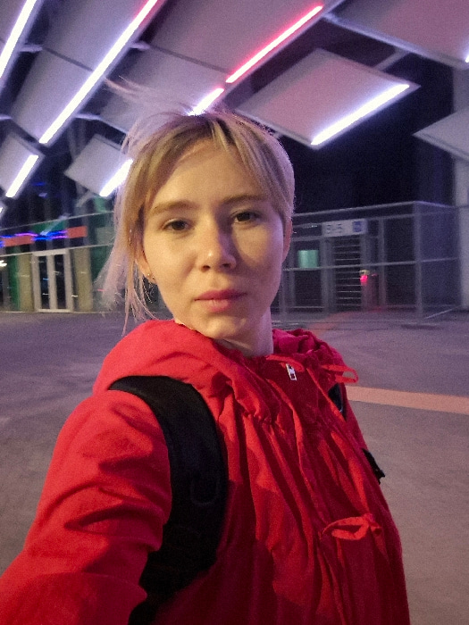 A blonde woman in a red jacket and black backpack is facing the camera. The background features a modern architectural design with white, diamond-shaped panels and embedded pink and white lights. A me…read more