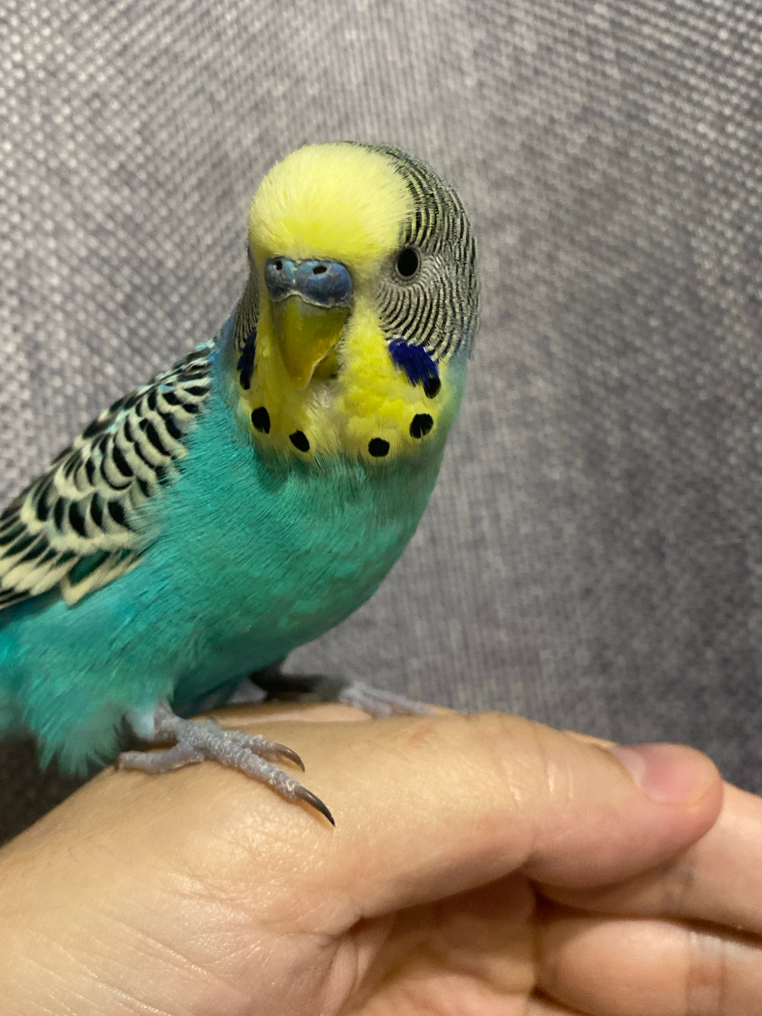 A close-up photograph captures a vibrant budgerigar perched on a human hand against a blurred, textured grey background. The budgerigar, possibly a male due to its distinct blue cere above the beak, f…read more