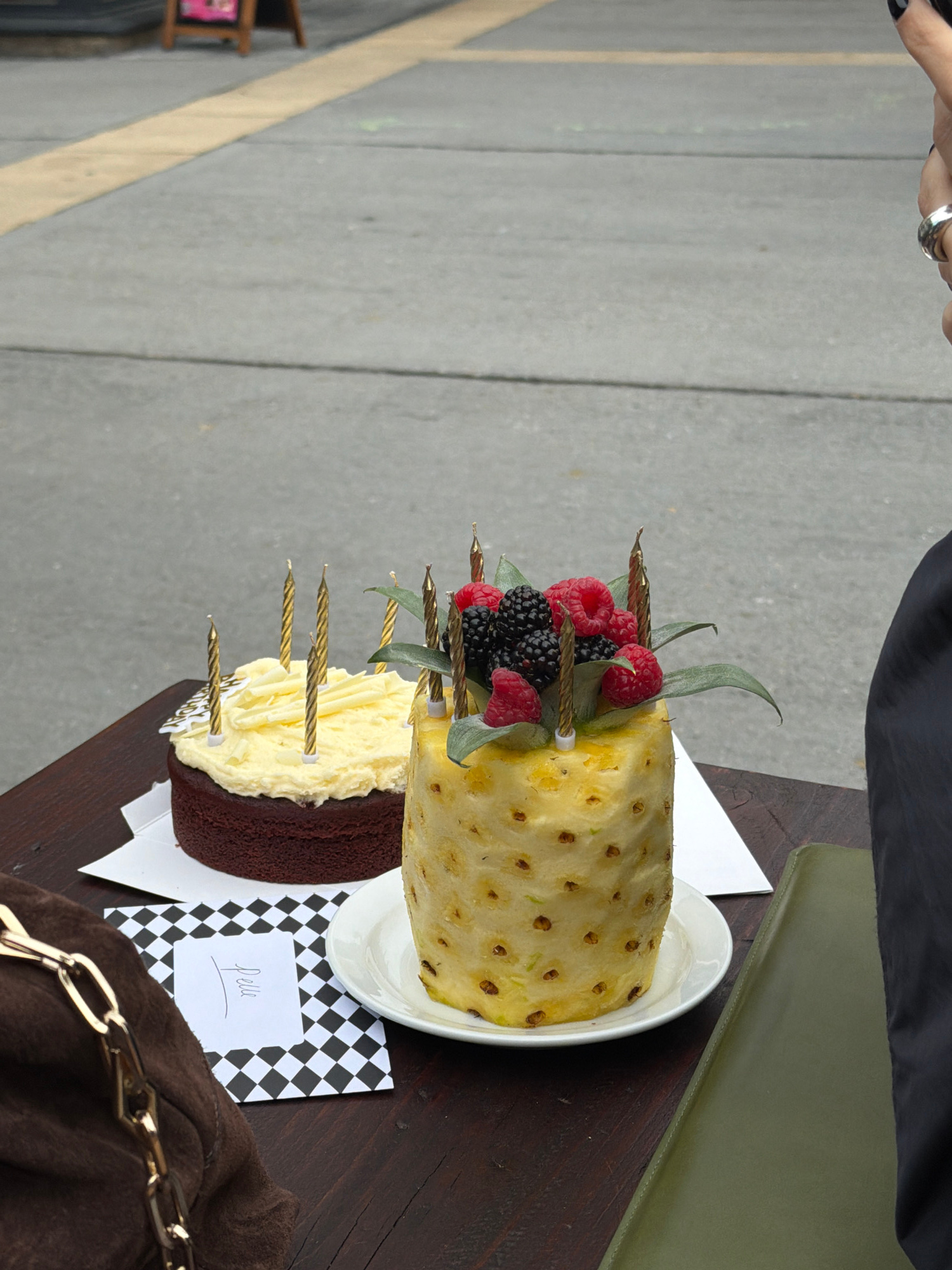 The image shows a birthday cake, partially made of pineapple, topped with raspberries and blackberries, with golden candles inserted. The cake sits on a white plate and is accompanied by a small card…read more