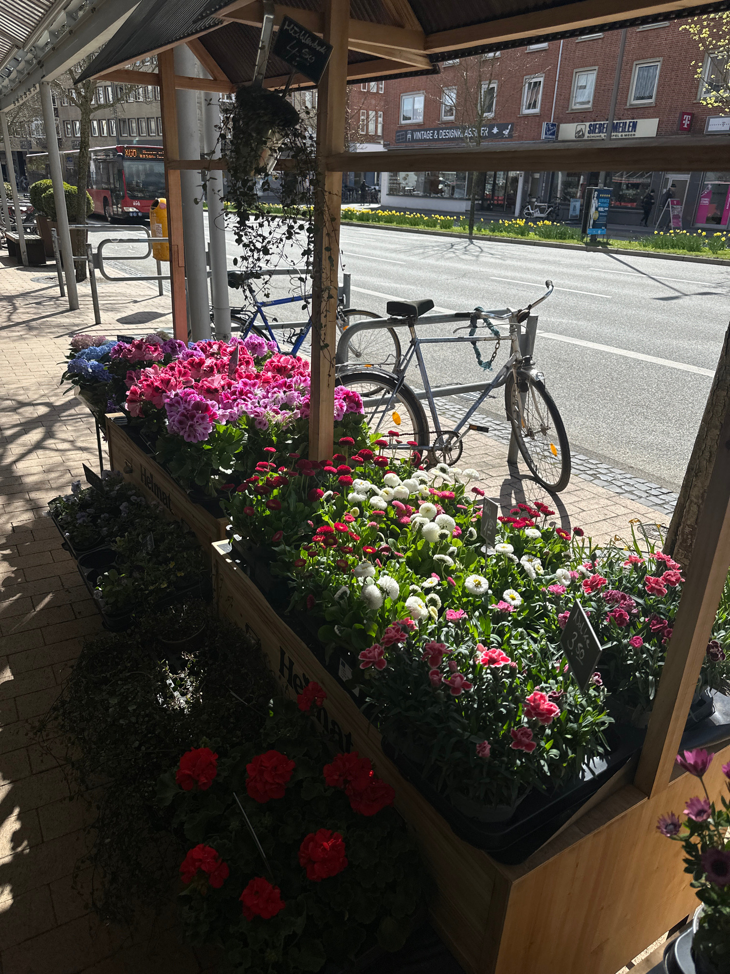 The image shows a street scene with a bicycle parked next to a flower display. The flowers are arranged in containers, with a variety of colors and types. Behind the bicycle is a street with buildings…read more