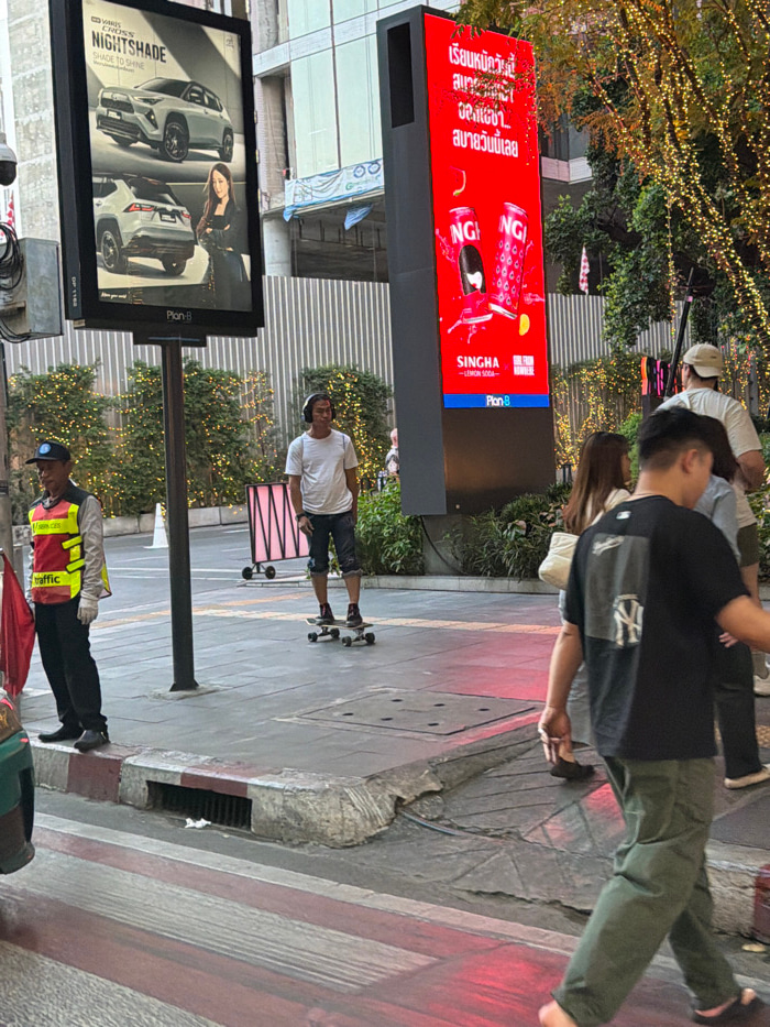 The image depicts an urban street scene in a commercial area of Bangkok, Thailand, during daylight hours. In the foreground, a concrete sidewalk features a red and white striped pedestrian crossing. O…read more