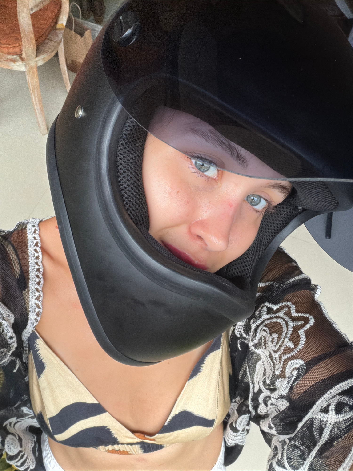 A person is wearing a black motorcycle helmet. The person has light skin, light colored eyes, and is wearing a top with a zebra print with a black, lacy overlay. The background is blurry and indistinc…read more
