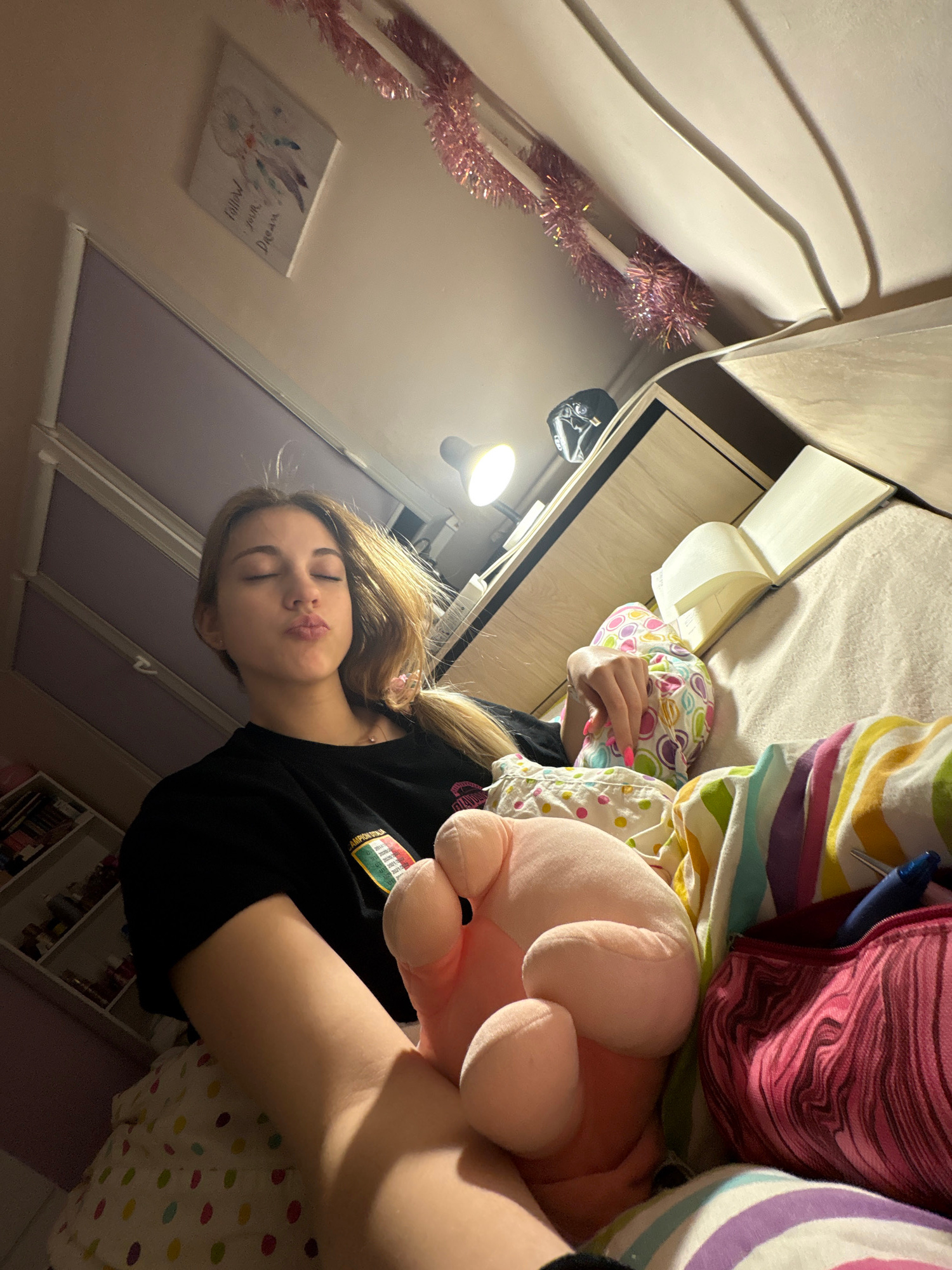 A young woman with blonde hair lies on a bed in a room with light purple walls. She is holding a pink stuffed animal pig. The room has a bed with colorful bedding, shelves with books, and a picture on…read more