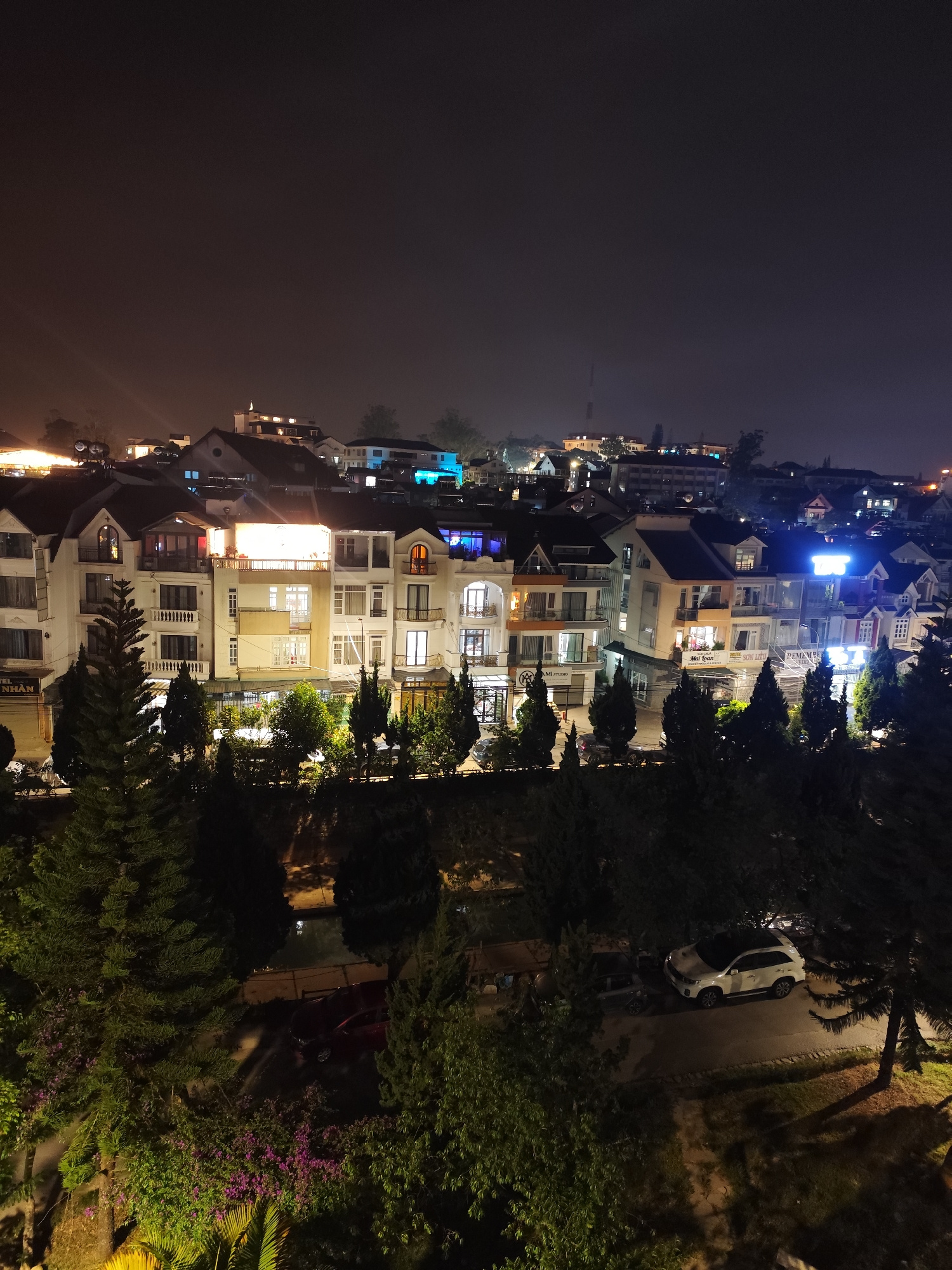 Captured at night, the image presents an elevated view of a section of Da Lat, Vietnam. The foreground contains a mix of trees and shrubbery, partially obscuring two parked vehicles: a red car and a w…read more