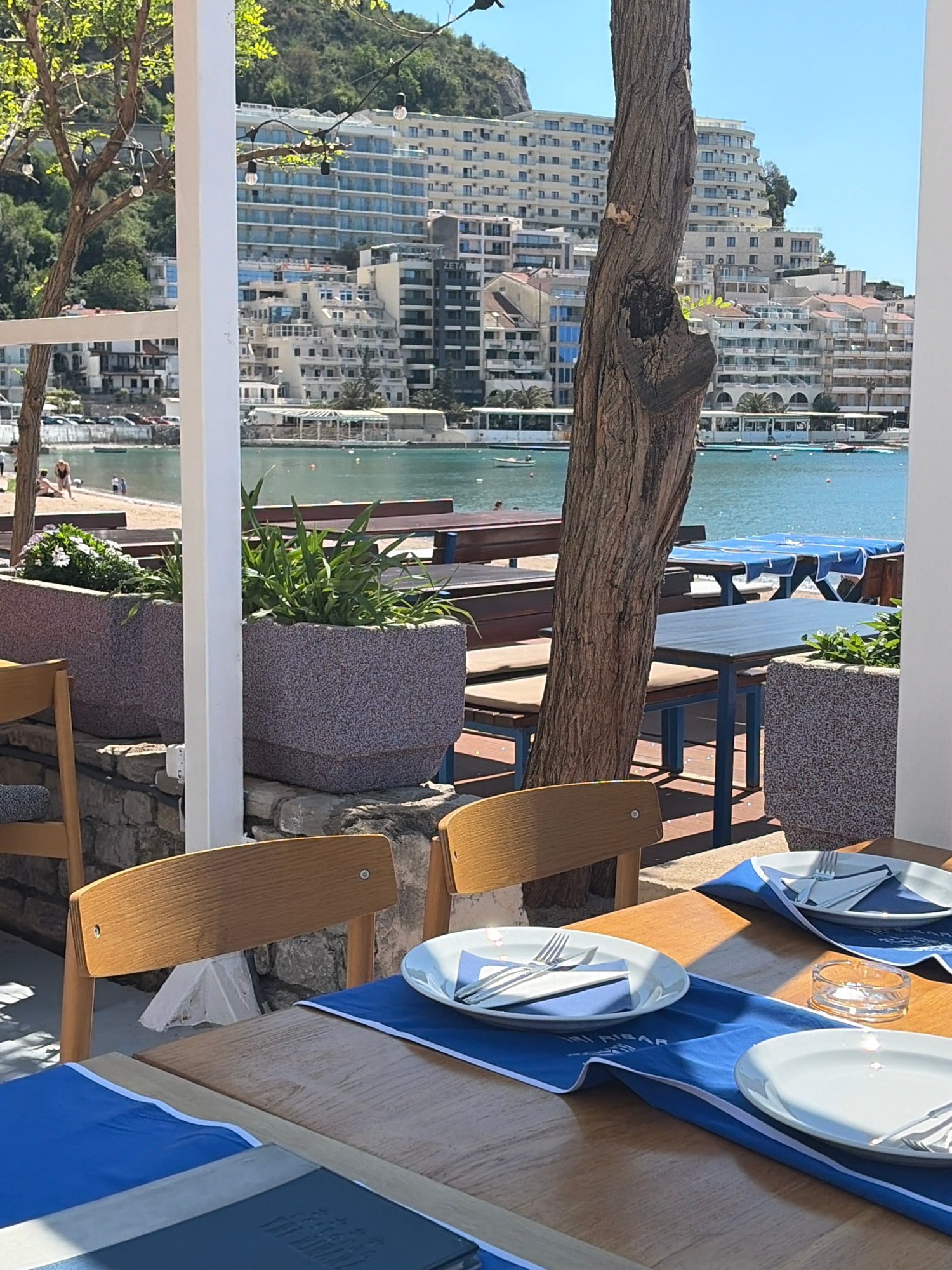 The image captures a scene from a restaurant or terrace in Rafailovići, Montenegro, overlooking the Adriatic Sea. The foreground features a dining table set with plates, cutlery, and blue placemats. S…read more